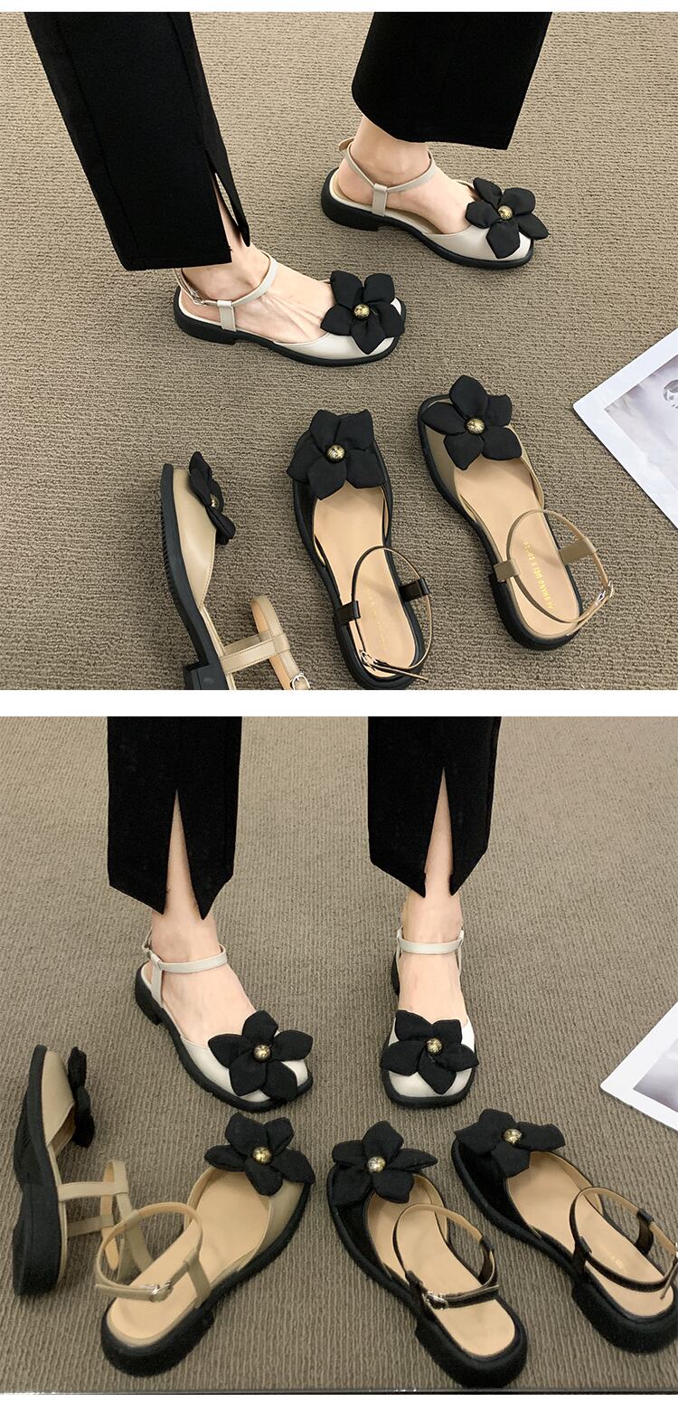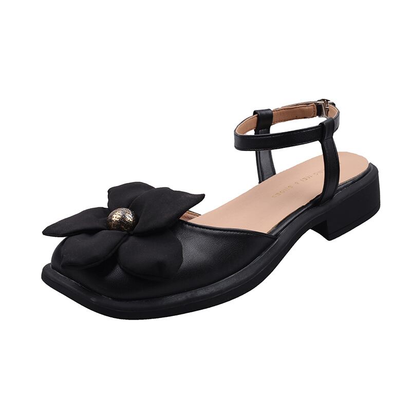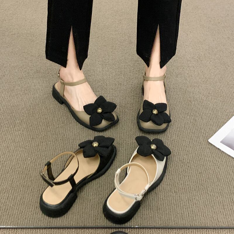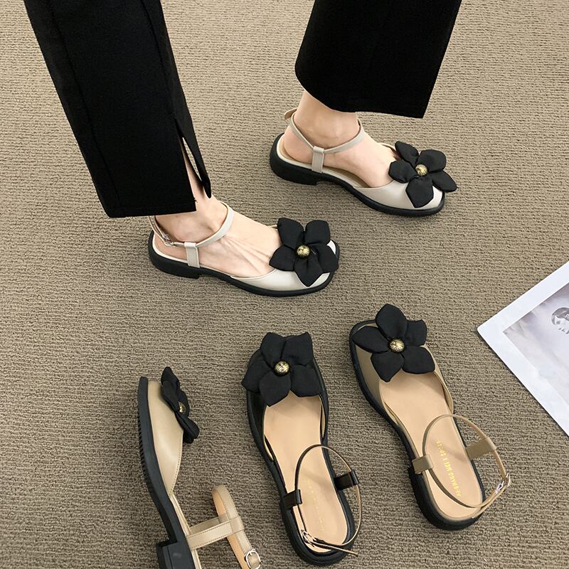 JiaBuフェイク包頭サンダルレディース2022年夏の新しいファッションオールマッチレトロフラワーローヒール滑り止めの小さな革の靴 シューズ サマー 夏物 レザー フラワーデザイン jxjxf48499237275