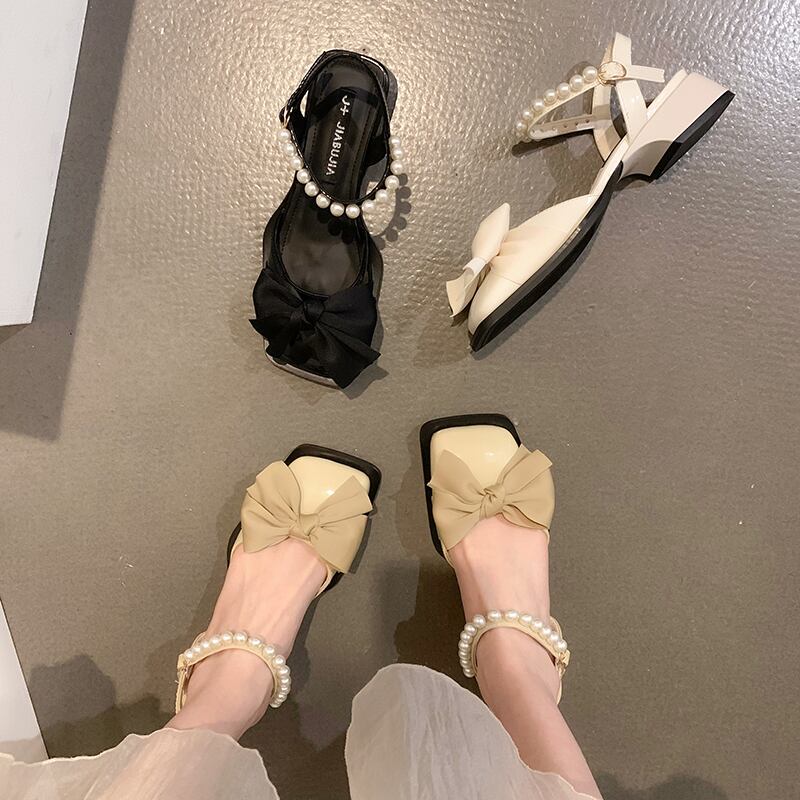 メリージェーンサンダルレディース2022夏の新しいファッションオールマッチパールボウローヒール滑り止めの小さな革の靴の潮流 シューズ リボン サマー 夏物 レザー 真珠 jxjxf9117570155