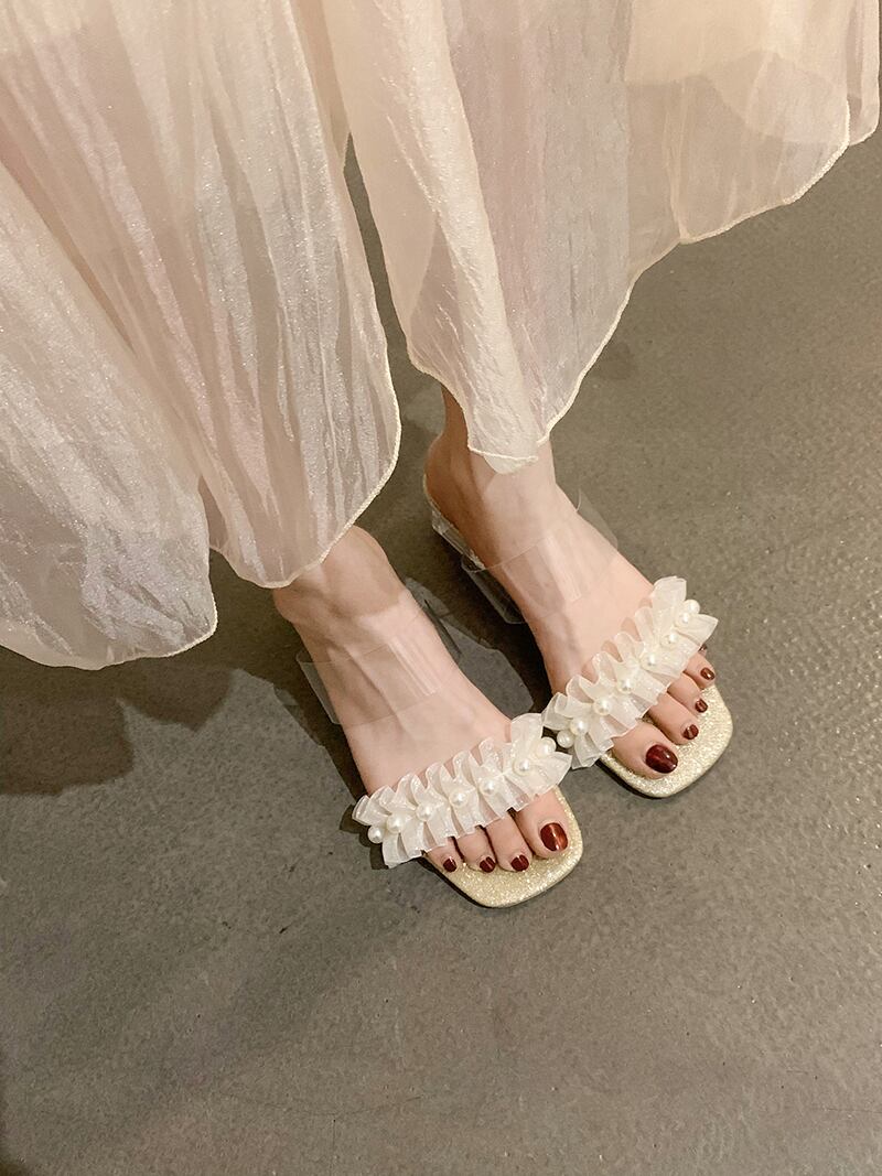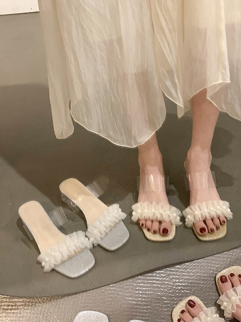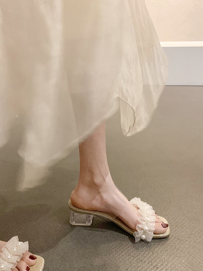 妖精風一言ひも女性の2022年夏の新しい真珠の透明なクリスタル、滑り止めのオールマッチサンダルとスリッパ ミュール 靴 シューズ サマー 夏物 パール jxjxf463391001