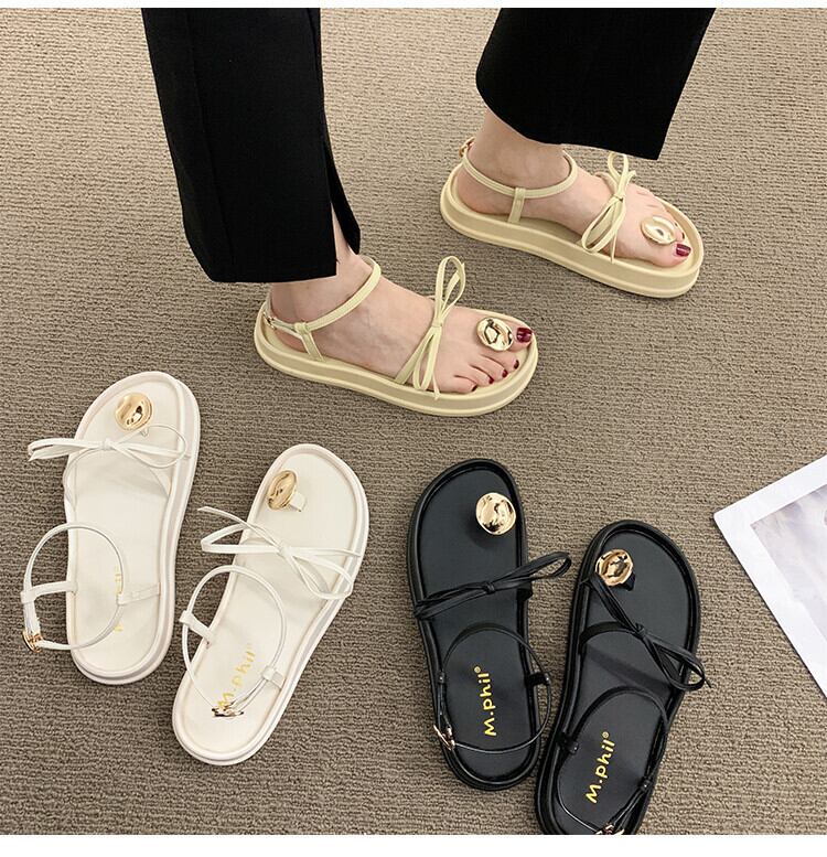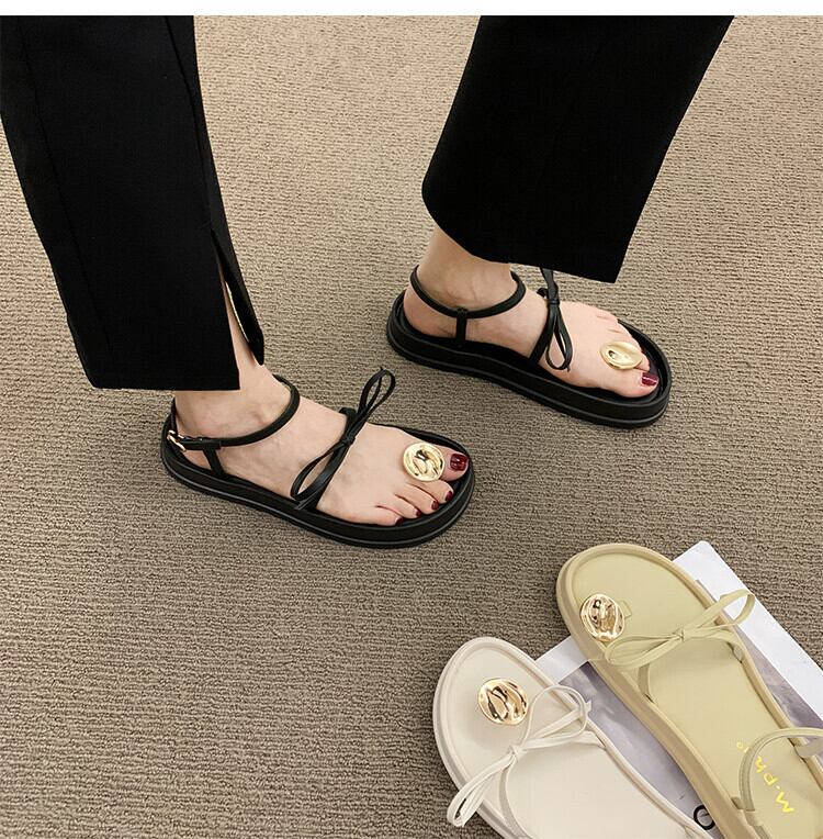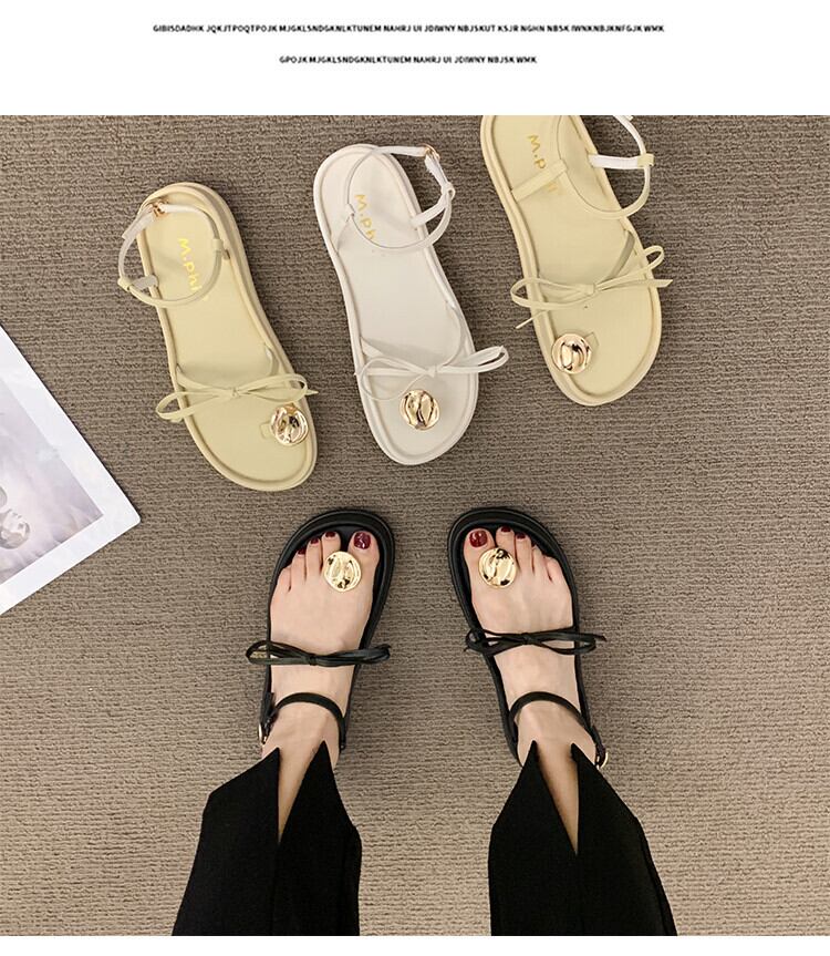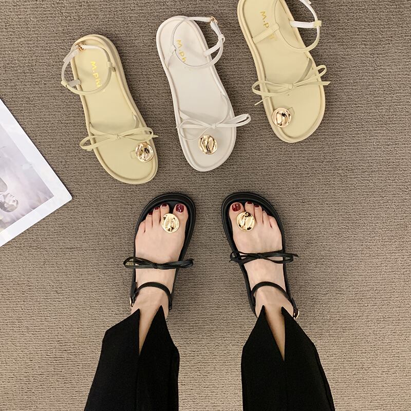 レトロサンダルレディース2022夏の新しいメタルボウフラット滑り止めネットレッドファッションオールマッチローマの靴 シューズ リボン サマー 夏物 jxjxf96155784925