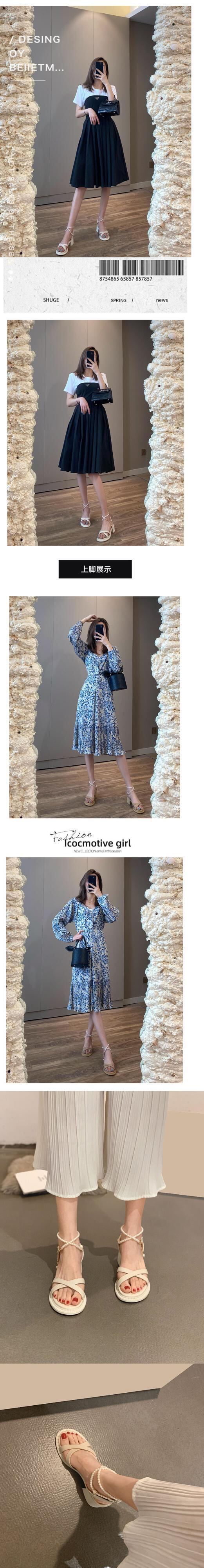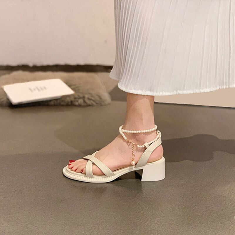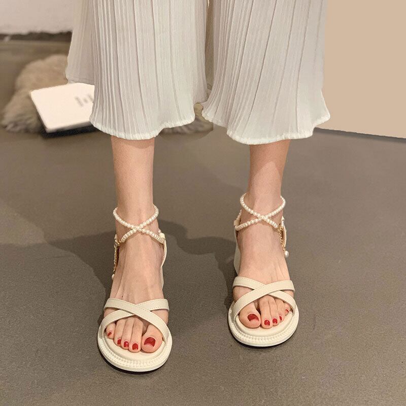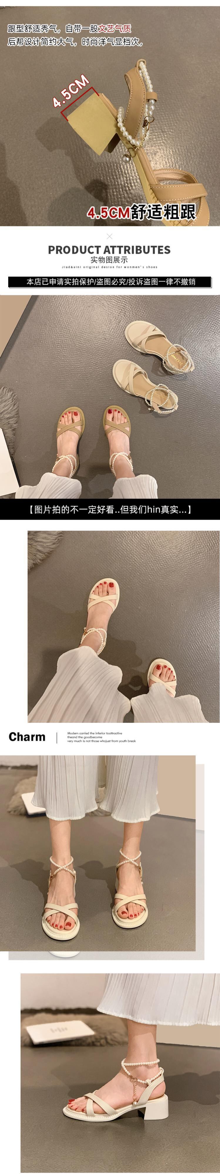 チャンキーヒールサンダルレディース2022夏の新しいクロスパールニッチ深夜の優しいフランスの妖精スタイルのハイヒール 靴 シューズ サマー 夏物 真珠 jxjxf89800907808