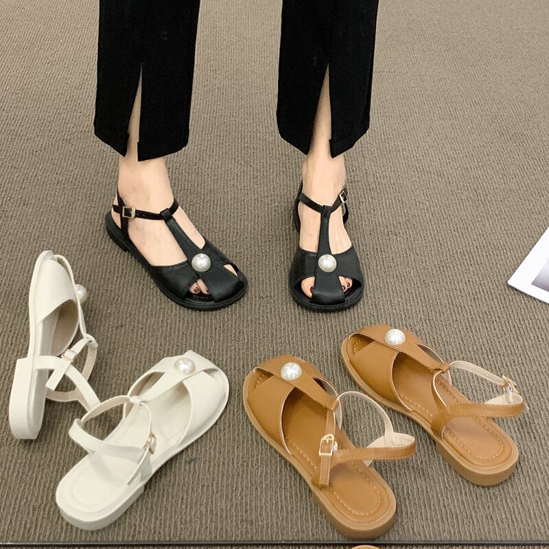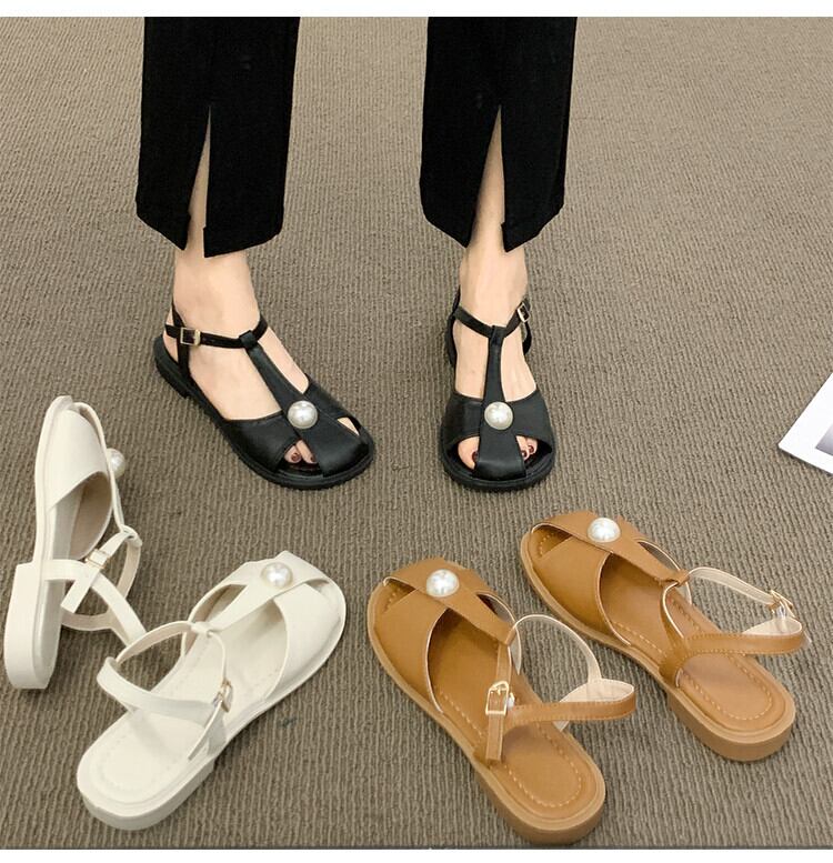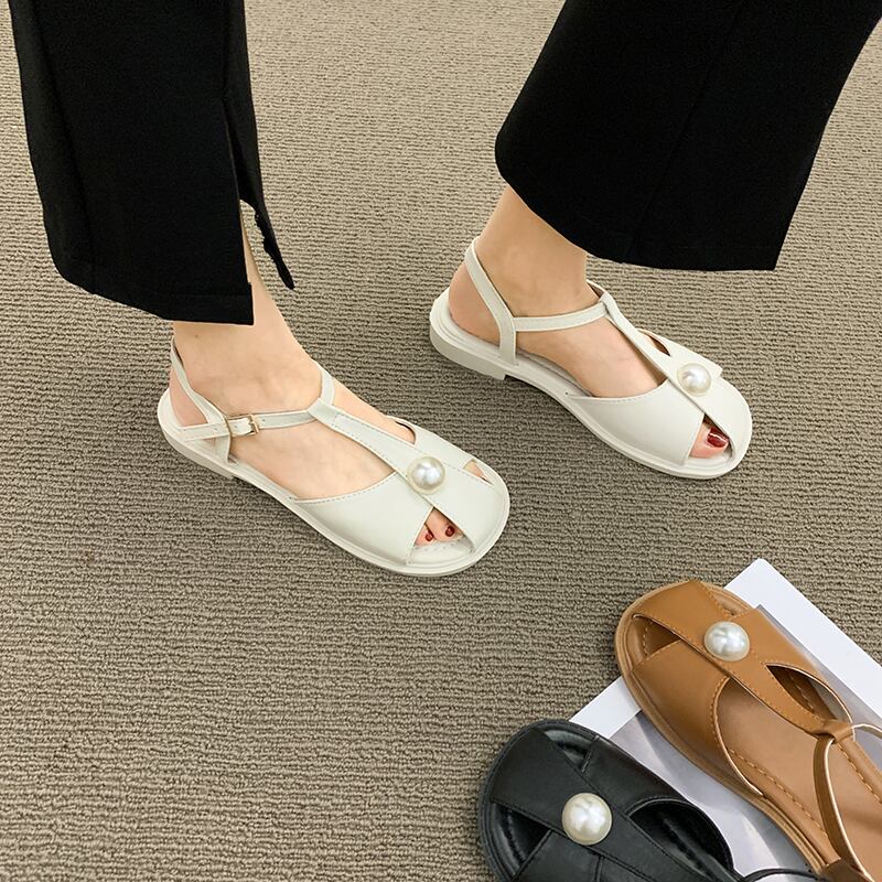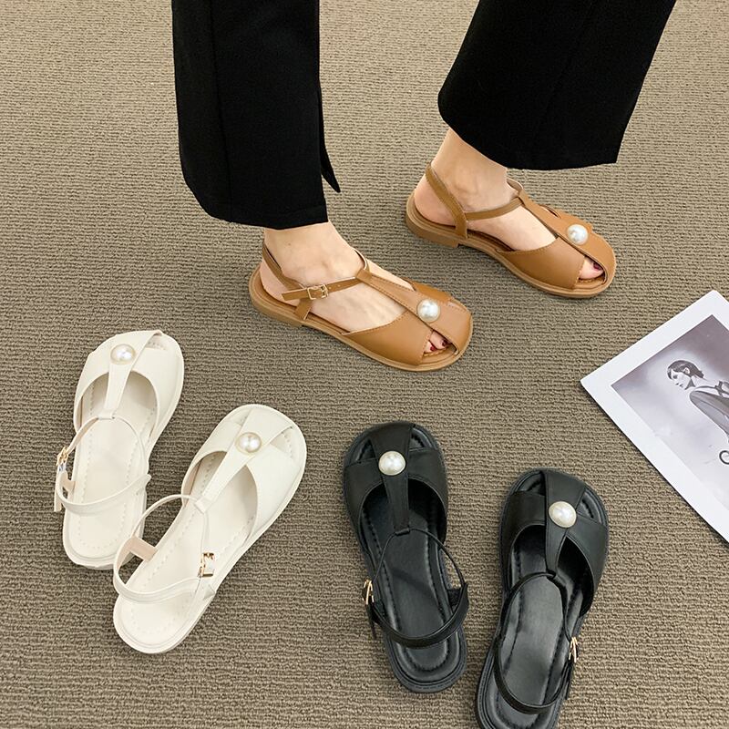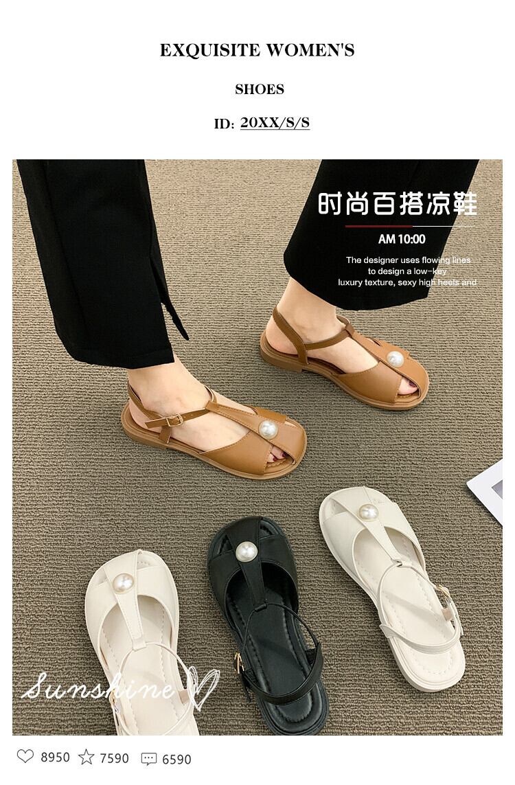 包頭サンダルレディース2022夏新作ファッションオールマッチレトロパールバックル平底滑り止めローマ靴潮 シューズ サマー 夏物 真珠 jxjxf2383313646