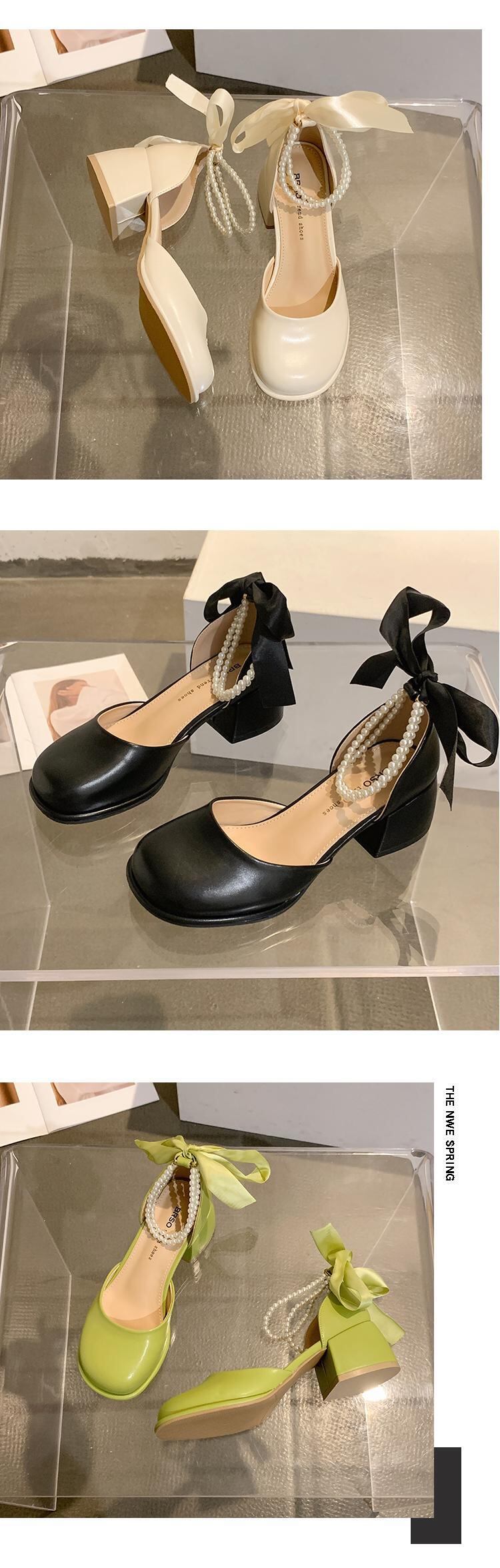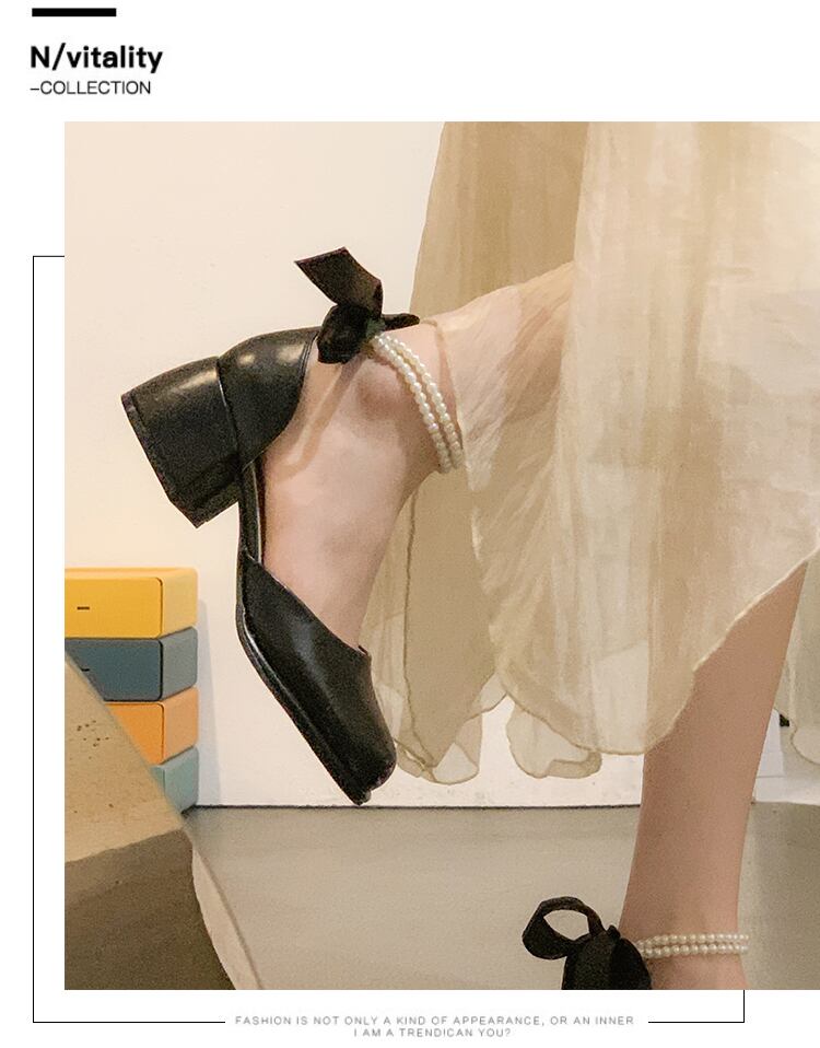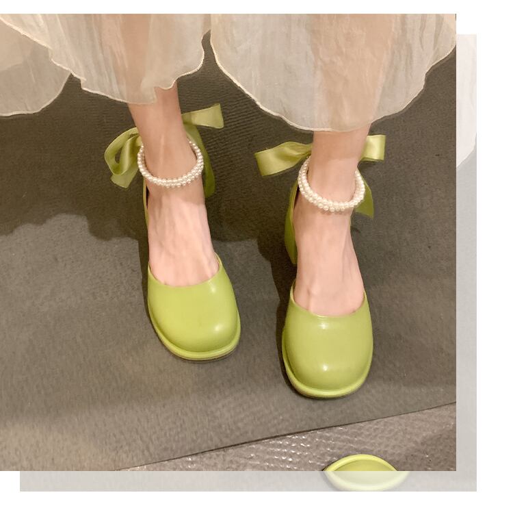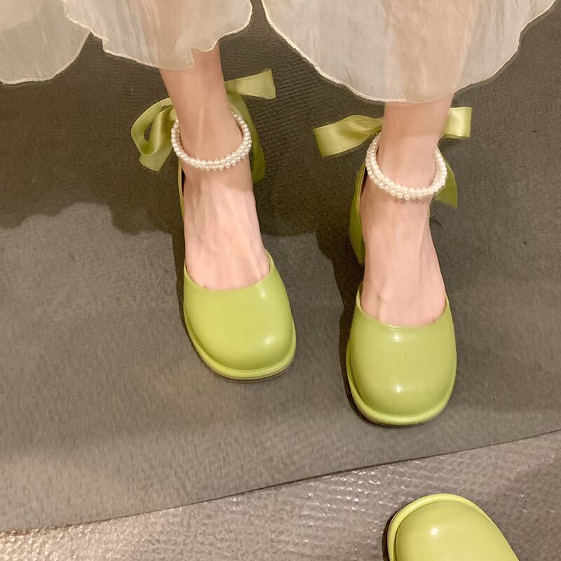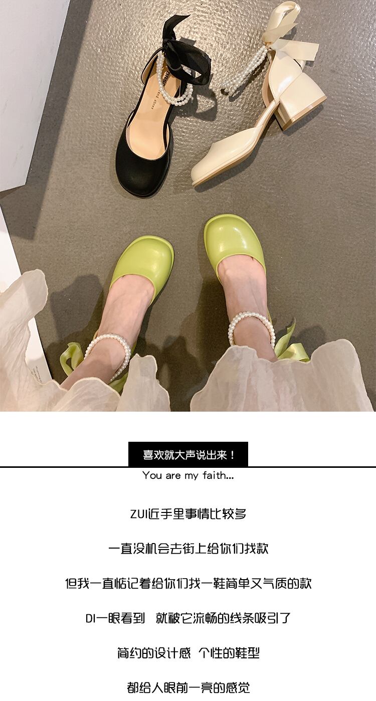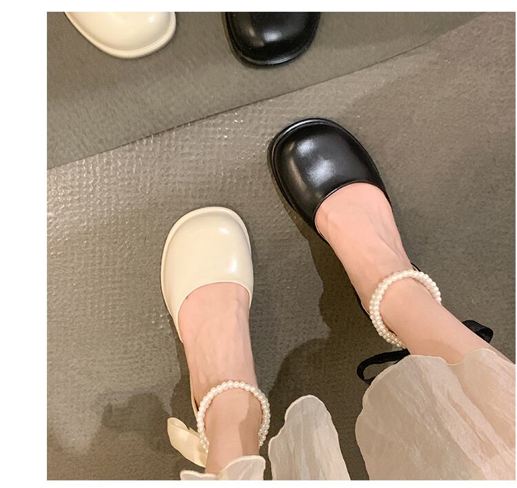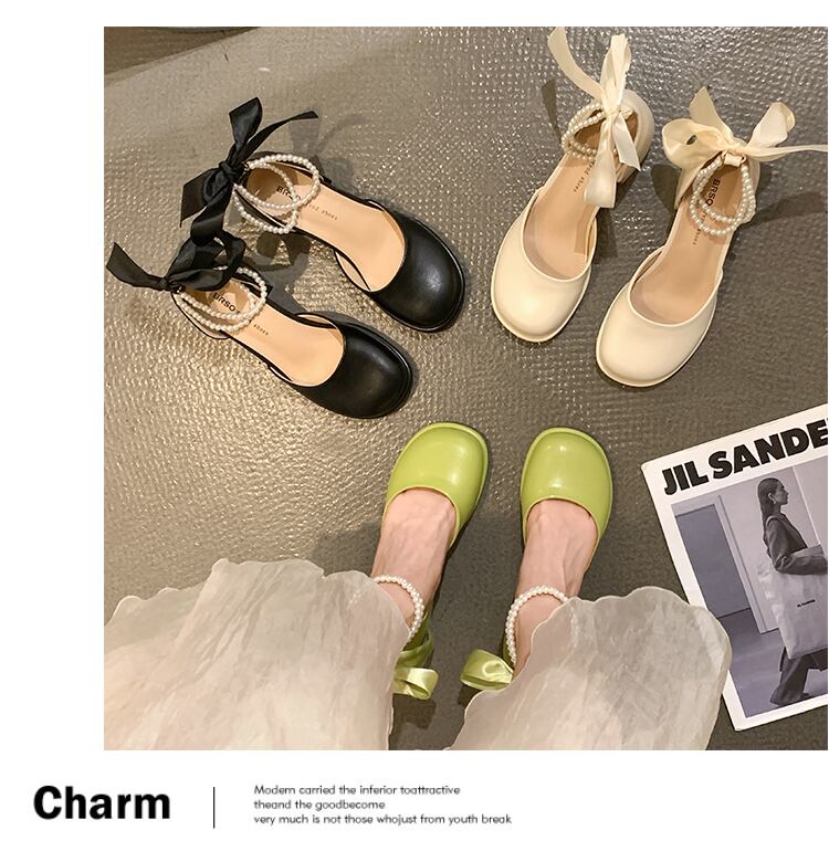シングルシューズ女性の2022年夏の新しいファッションオールマッチレトロパールレースアップラウンドトゥ厚手のヒール滑り止めメアリージェーンシューズ 靴 サマー 夏物 ラウンドトー 真珠 jxjxf97375437570