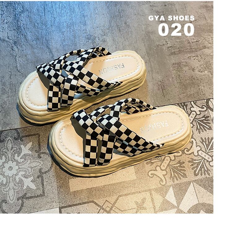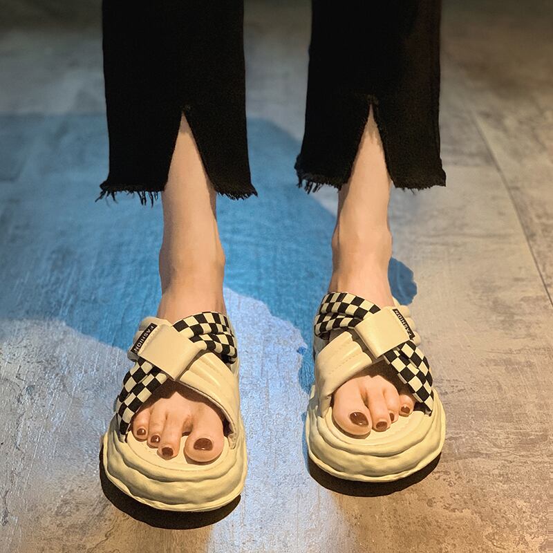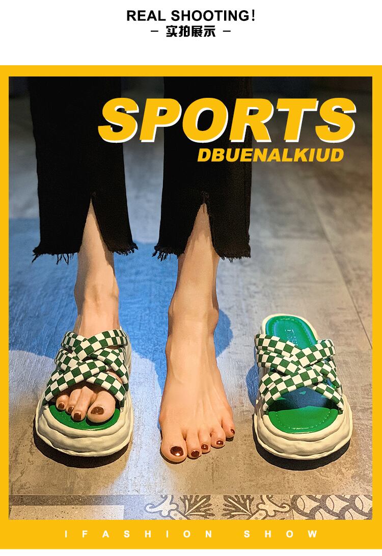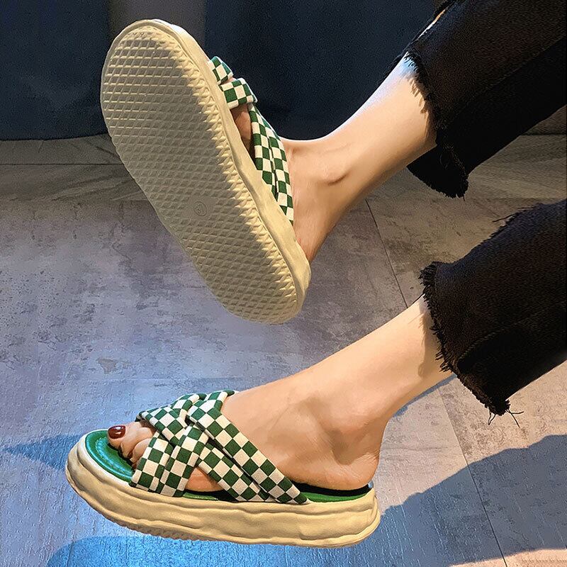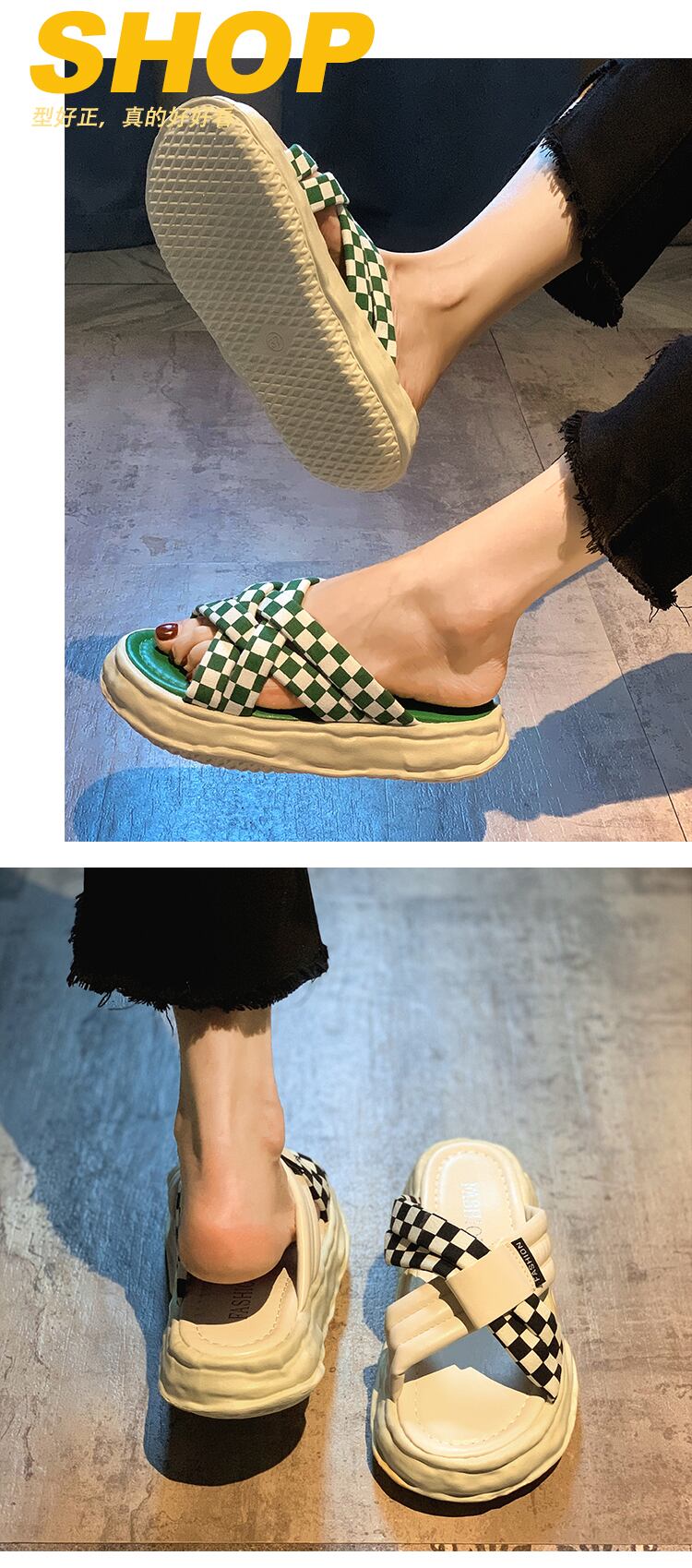一言フリップフロップ女性の2022年夏の新しいチェッカーボードクロス厚い底滑り止めファッションオールマッチディゾルブスリッパ ミュール 靴 シューズ サマー 夏物 jxjxf92078980961