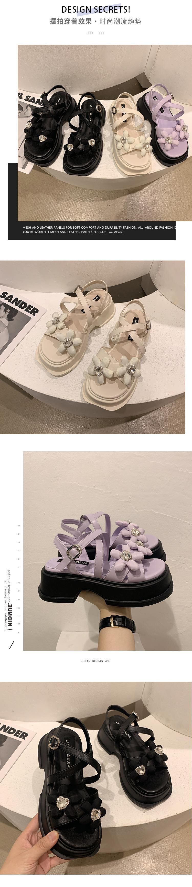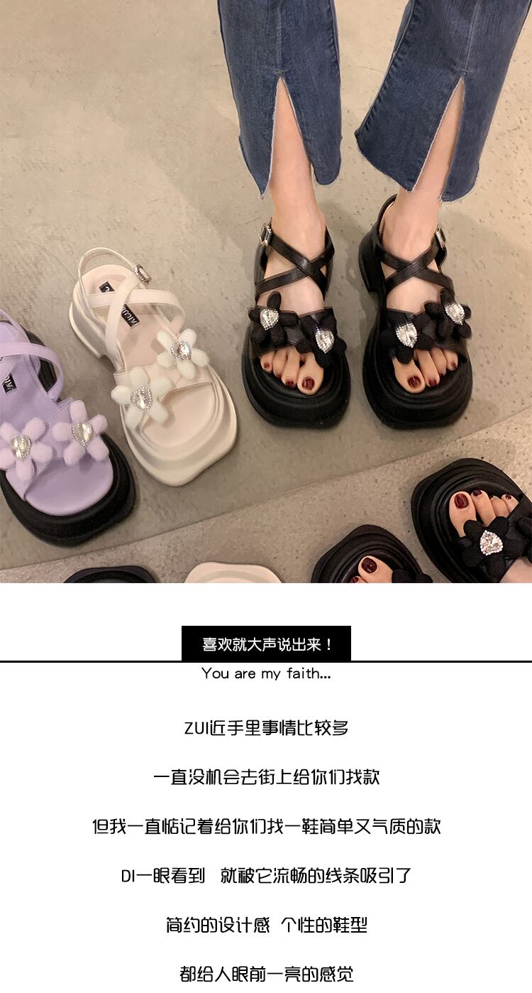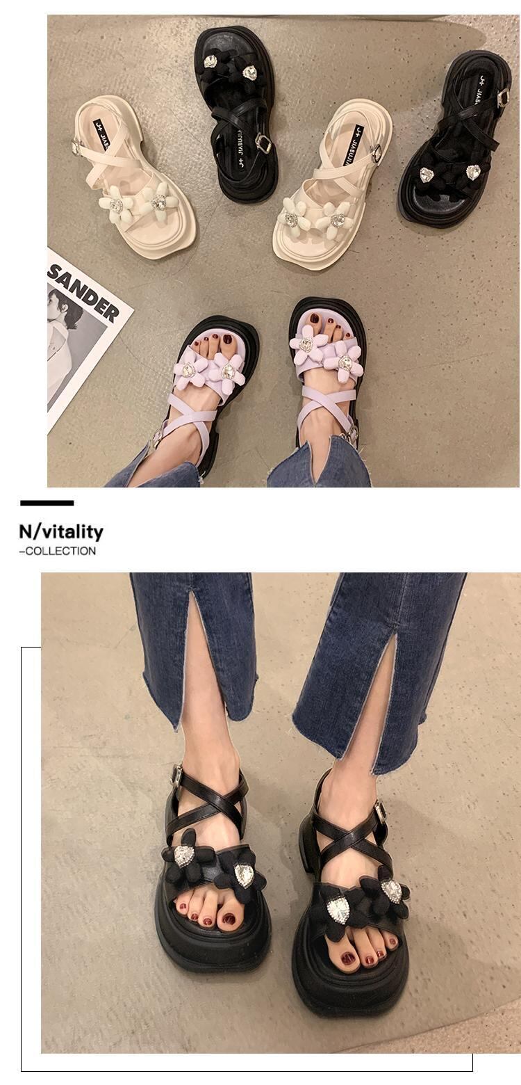 ネットレッドサンダルレディース2022夏の新しいかわいい花厚いかかと滑り止めファッションオールマッチ小さなローマの靴 シューズ ヒール 大人ガーリー スウィート キュート カジュアル サマー 夏物 フラワーデザイン jxjxf35996581063
