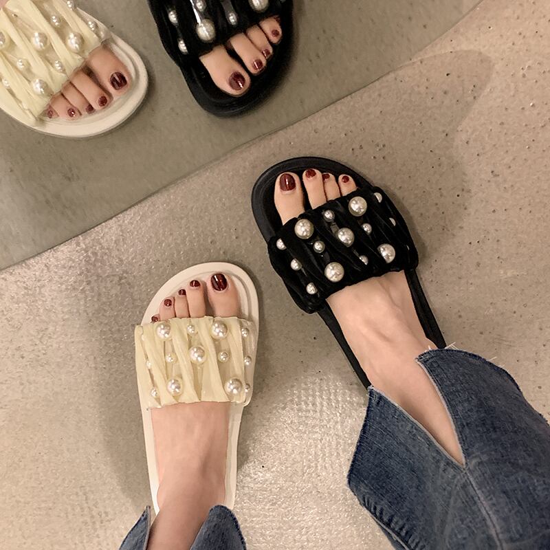 2022年夏に着用するレディーススリッパ新しいファッションオールマッチレトロパールエインスタイルフラットボトム滑り止めワードドラッグタイド ミュール 靴 シューズ サマー 夏物 真珠 jxjxf61820367883