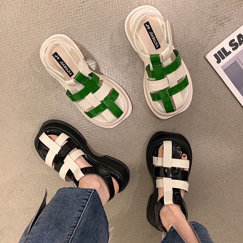 レトロ包頭サンダルレディース2022夏ベルクロ編み込み厚手のヒール滑り止めオールマッチローマンシューズ 靴 サマー 夏物 jxjxf56820409418