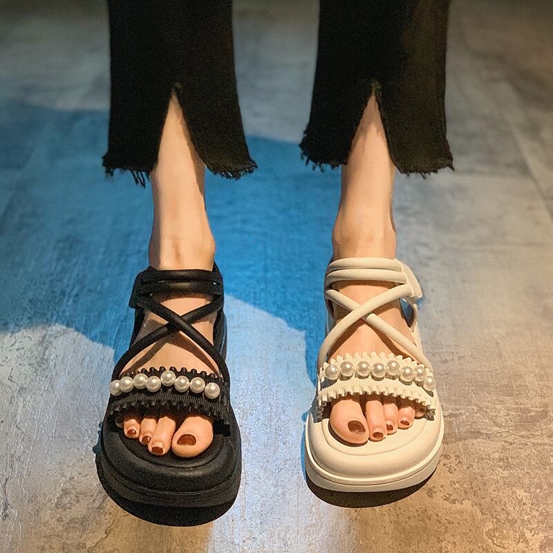 サンダル女性の2022年夏の新しい真珠ベルクロスポンジケーキ滑り止めファッションオールマッチ学生カジュアルビーチシューズ 靴 サマー 夏物 パール jxjxf14960138593