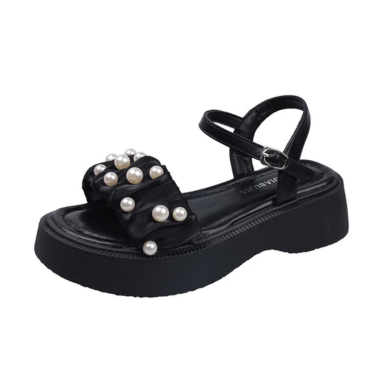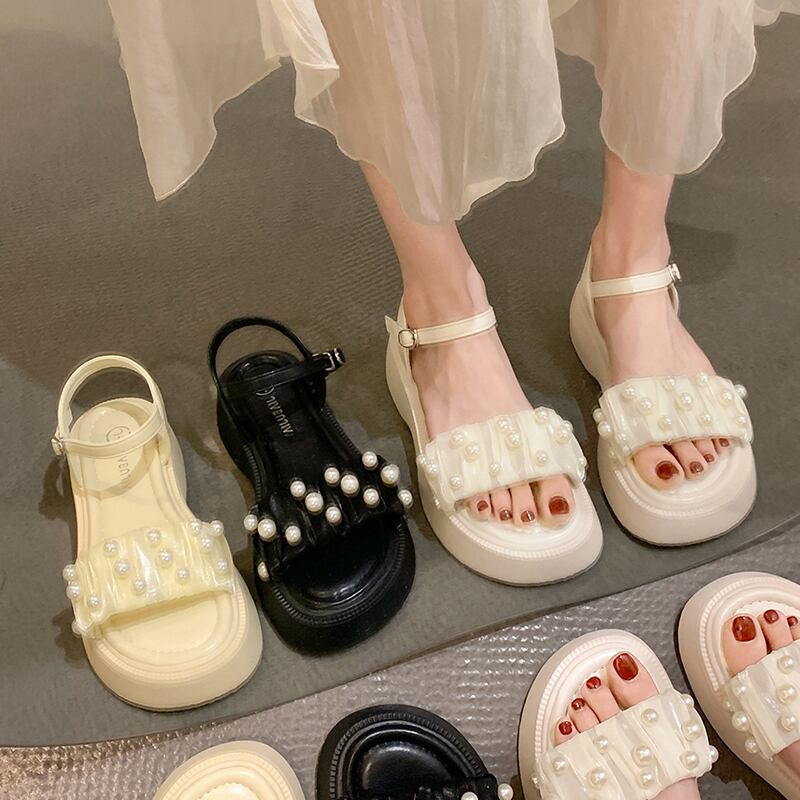 一言ベルトオープントゥサンダル女性の2022年夏の新しい真珠の厚い底滑り止めのファッションオールマッチフェアリースタイルのローマの靴 シューズ サマー 夏物 ハーネス パール jxjxf8351341981