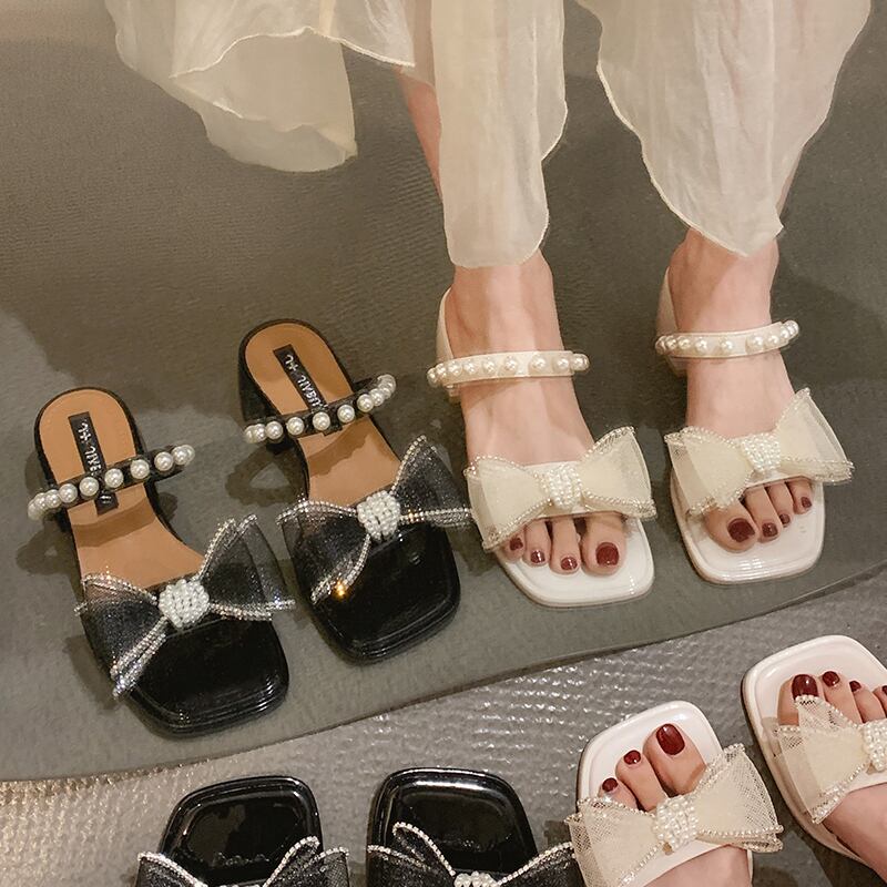 ネット赤いスリッパ女性2022年夏の新しいファッションパールボウ厚いヒール滑り止めの妖精風一言サンダルとスリッパ レッド リボン ミュール 靴 シューズ サマー 夏物 真珠 jxjxf82459325138