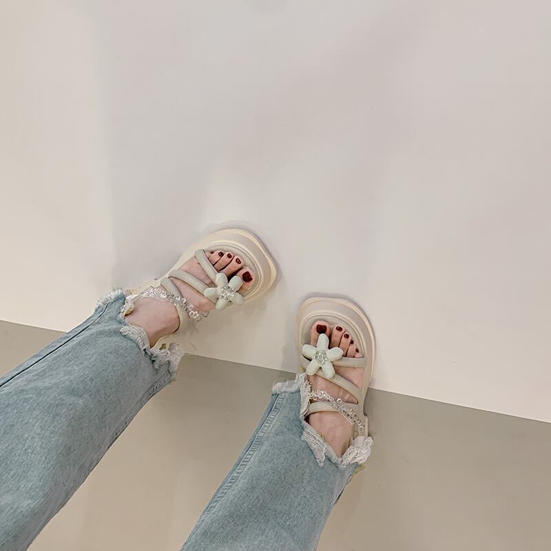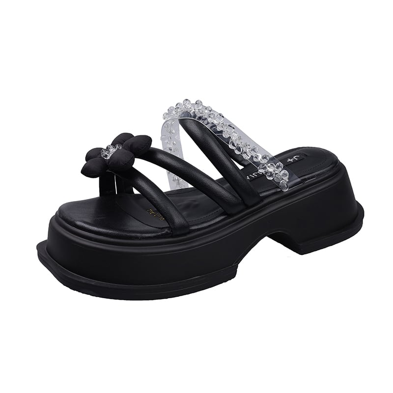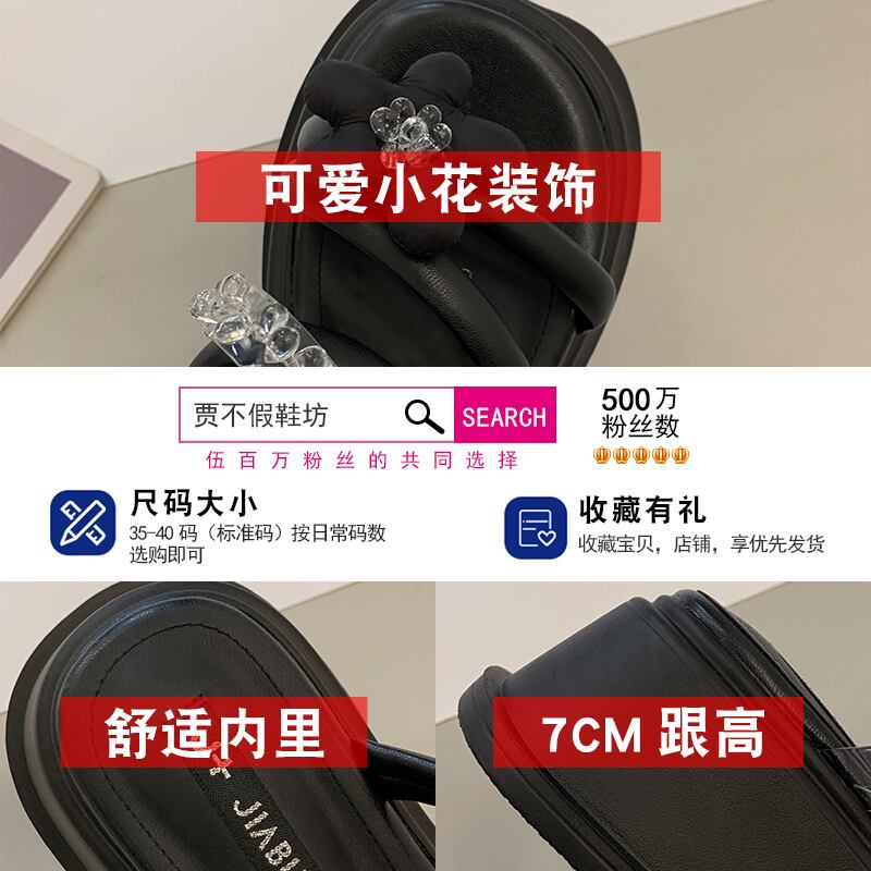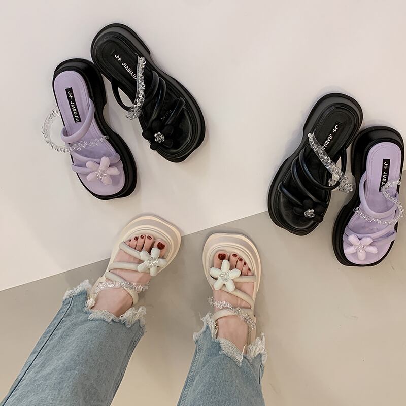 女性の2022年夏の新しいスタイルのクリスタルフラワー厚手のヒール滑り止めネットセレブファッションオールマッチサンダルとスリッパ ミュール 靴 シューズ サマー 夏物 フラワーデザイン jxjxf52785801790