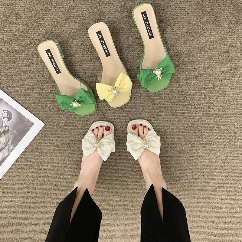 ネットの赤いスリッパの女性は2022年夏の新しいファッションオールマッチパールボウクリスタルの厚いヒールサンダルを履いています レッド リボン ミュール 靴 シューズ サマー 夏物 真珠 jxjxf49739214428