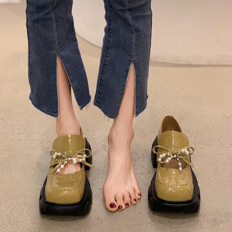 小さな革の靴女性の2022年夏の新しいパールボウスクエアヘッド厚いヒール滑り止めファッションオールマッチレトロシューズ リボン サマー 夏物 レザー 真珠 スクウェア jxjxf17549747451