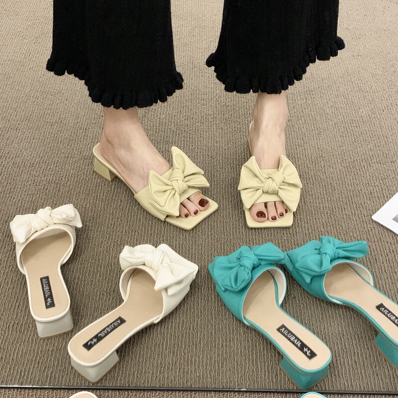 スリッパ女性の夏のアウターウェア2022年の新しい弓の厚いかかと滑り止めのファッションオールマッチの妖精スタイルのレトロなハーフスリッパ リボン ヒール 靴 シューズ ミュール サマー 夏物 jxjxf97031869807