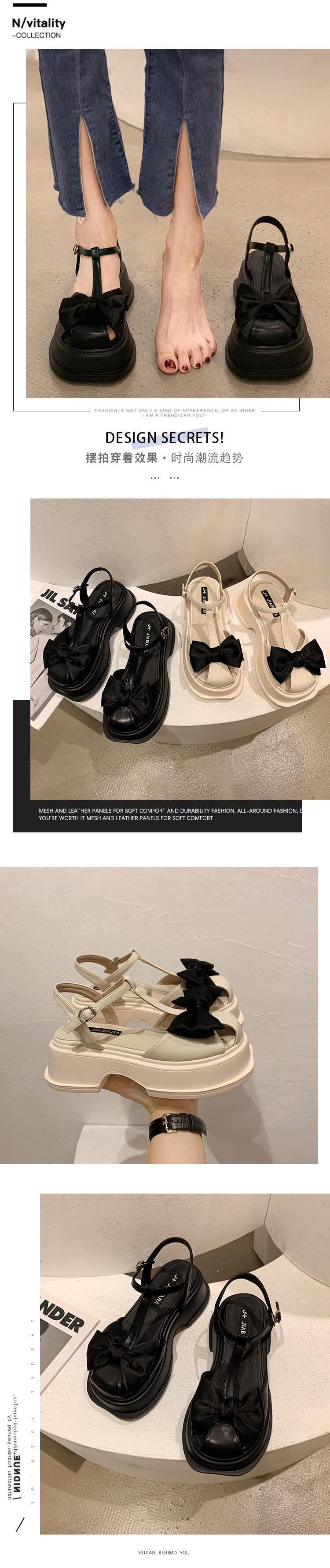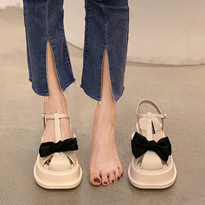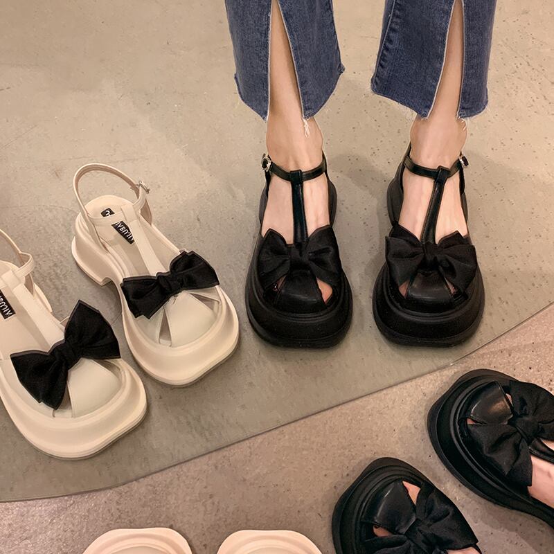女子バオトウサンダル2022サマーボウノットシックヒールノンスリップネットレッド多用途レトロローマシューズ 靴 リボン 夏物 jxjxf72779961839