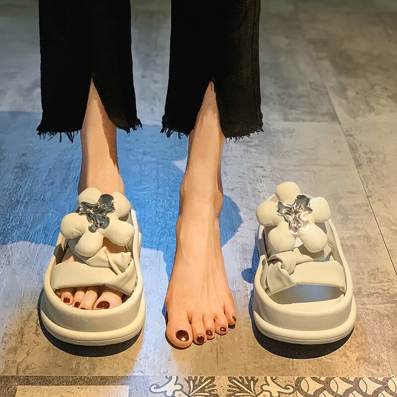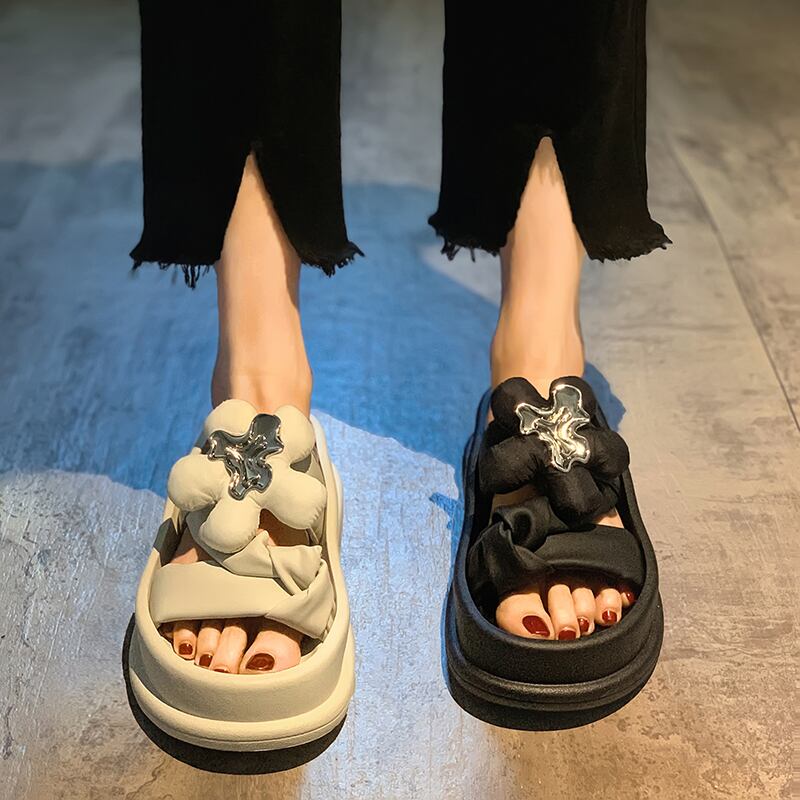 女性の夏の2022年夏の外のスリッパ新しいファッショントレンドネット赤い超火の妖精の花厚い底を高めるサンダル レッド ミュール 靴 シューズ サマー 夏物 フラワーデザイン jxjxf53953372018