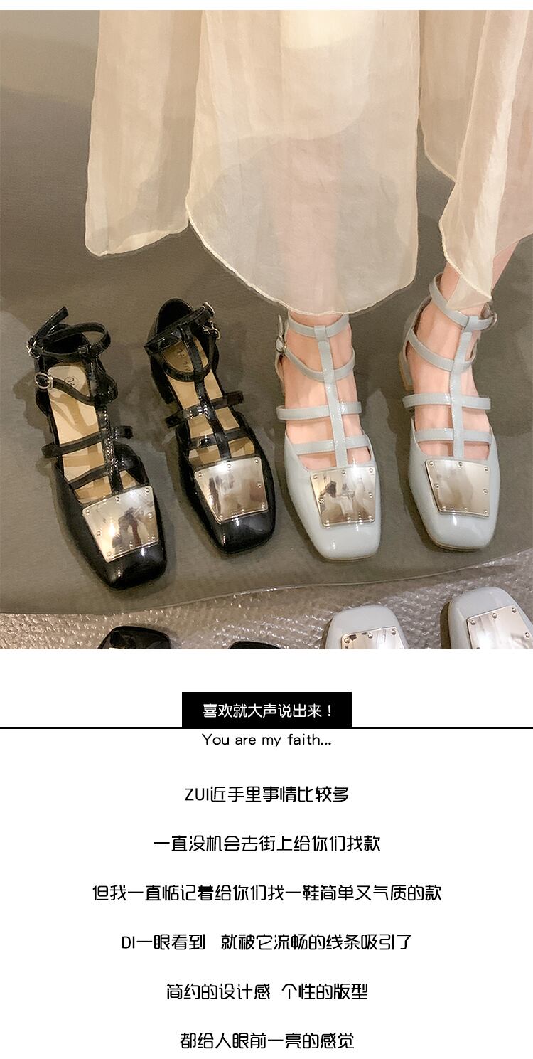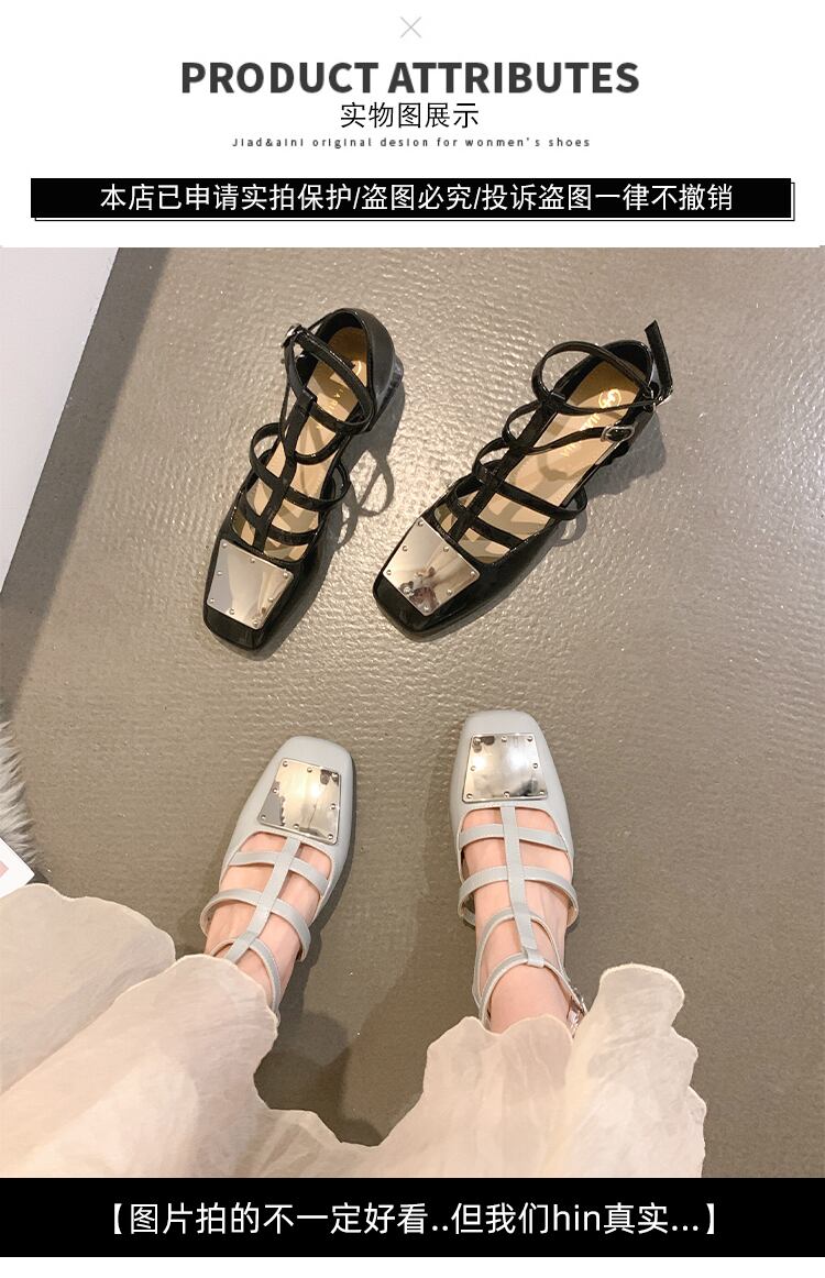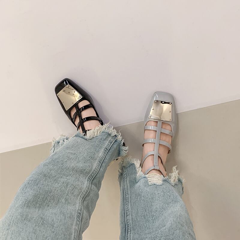 フラットシューズ女性の2022年夏の新しいフランスのレトロな金属気質通勤者オールマッチスクエアヘッド中空の小さな革の靴 サマー 夏物 レザー スクウェア jxjxf80339691516