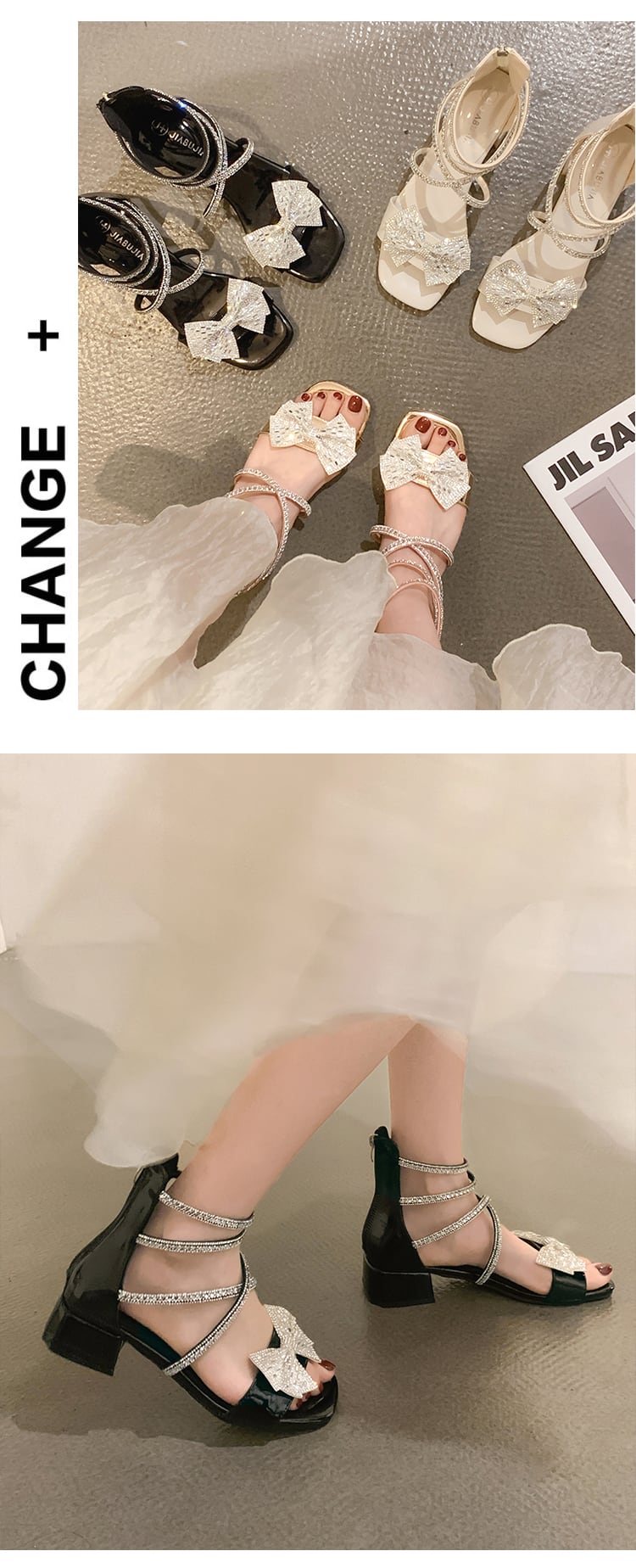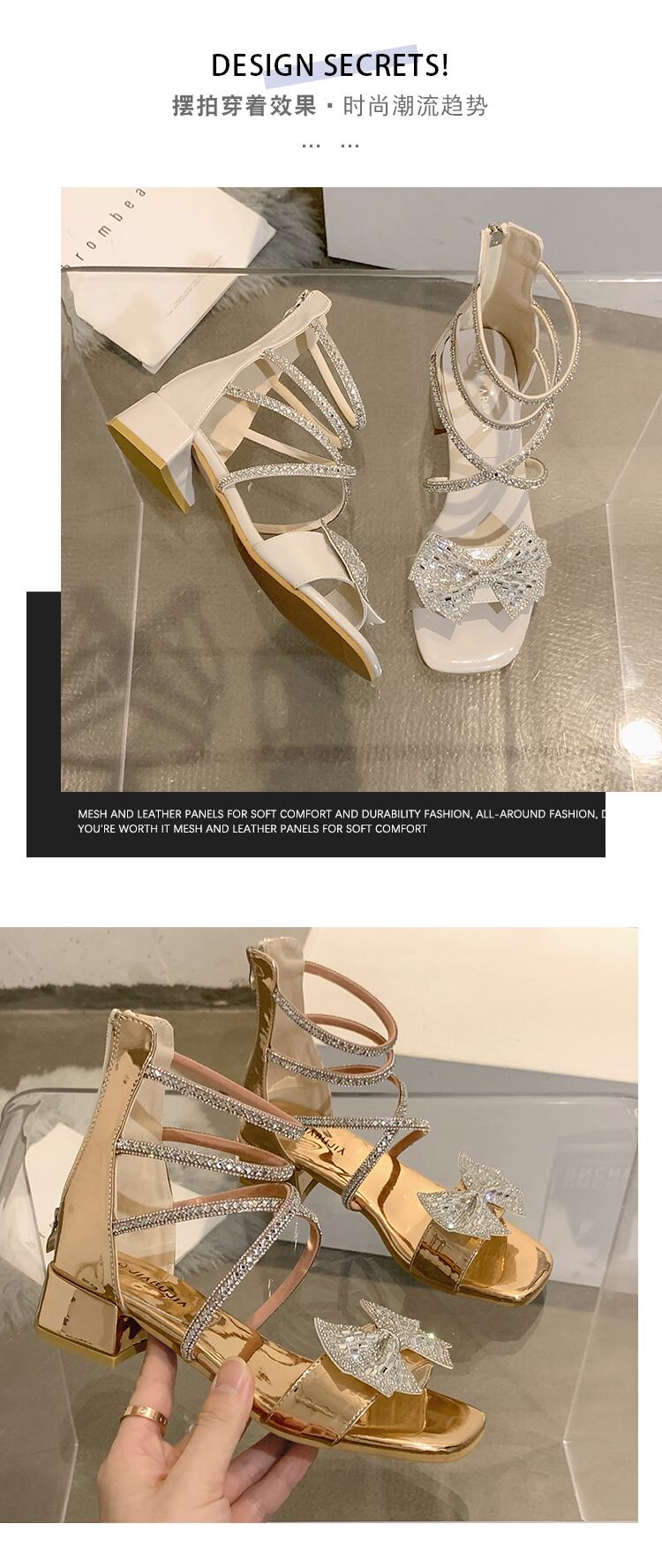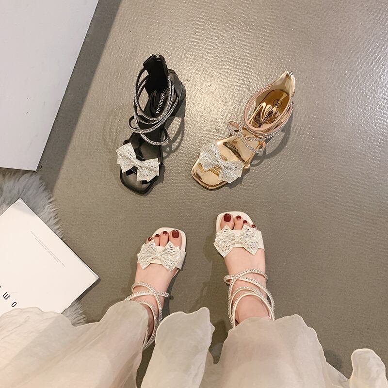 女性のファッションサンダル2022年夏の新しいレトロなラインストーンの弓厚いヒール滑り止めの妖精スタイルのローマの靴 シューズ リボン サマー 夏物 jxjxf14659724556