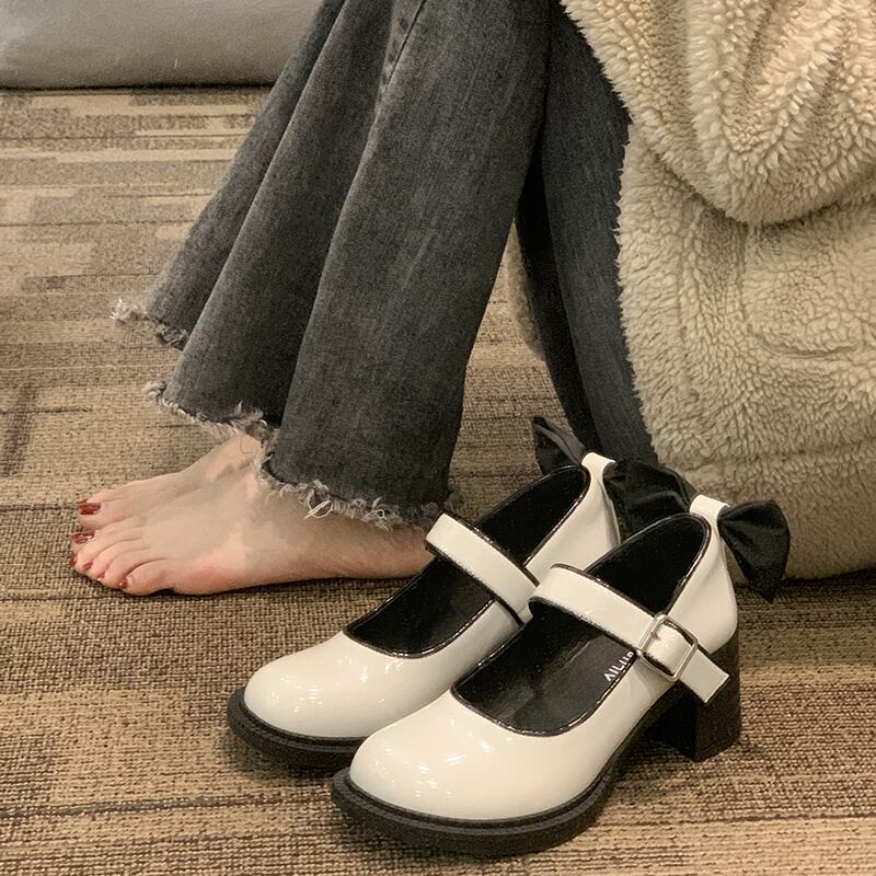 インターネット有名人メリージェーン靴女性の 2023 春の新ファッション eign スタイル弓厚いヒールノンスリップ ese 小さな革靴 シューズ リボン スプリング 春物 レザー jxjxf53877532843