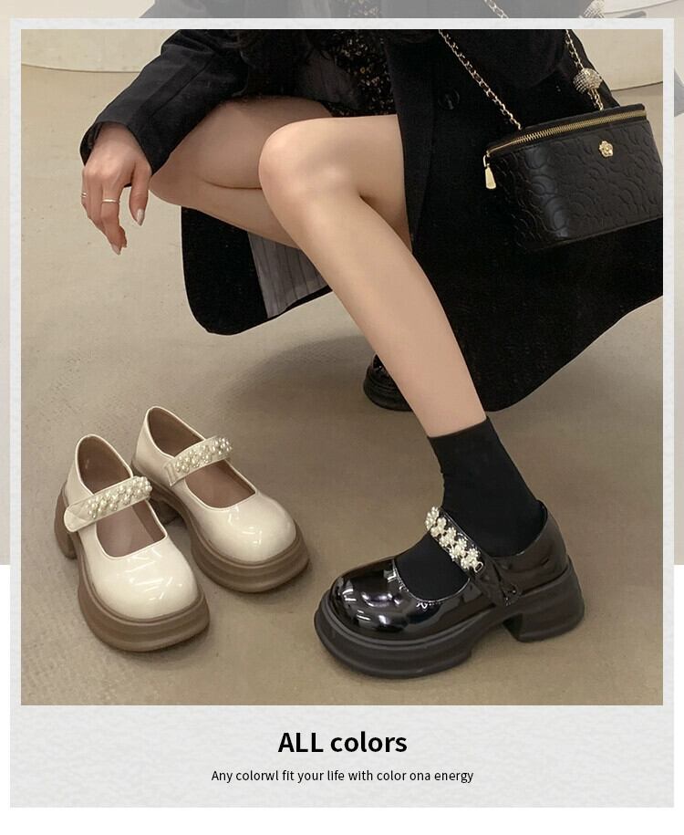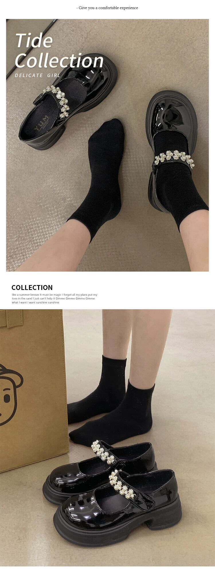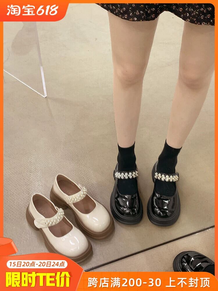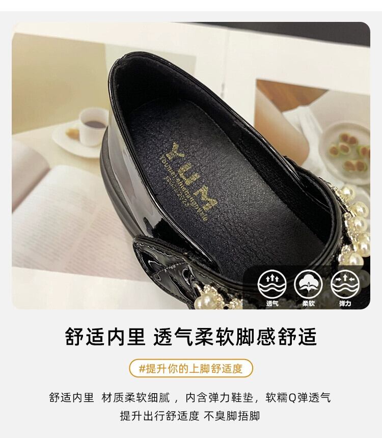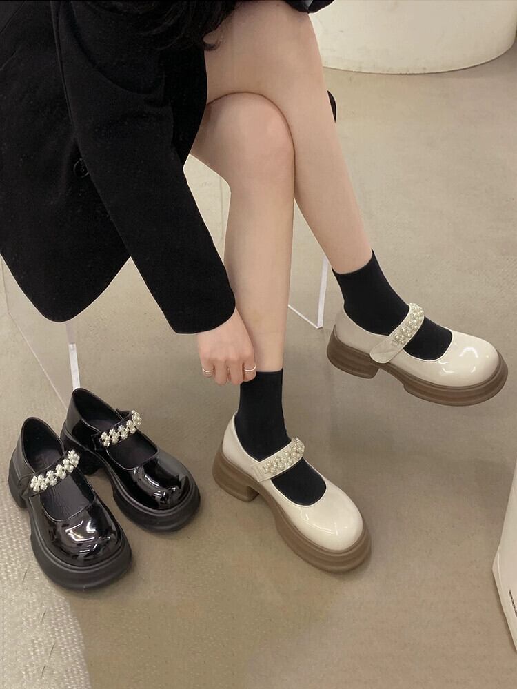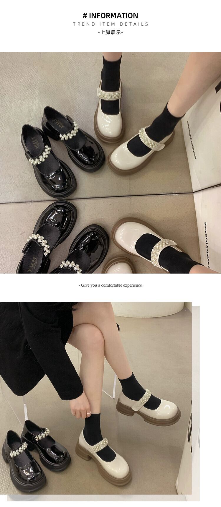 ese シングルシューズの女性の 2023 春の新ファッションオールマッチ eign スタイルパールベルクロ厚いヒールラウンドトゥ小さな革靴 スプリング 春物 ラウンドトー レザー 真珠 jxjxf28966672876