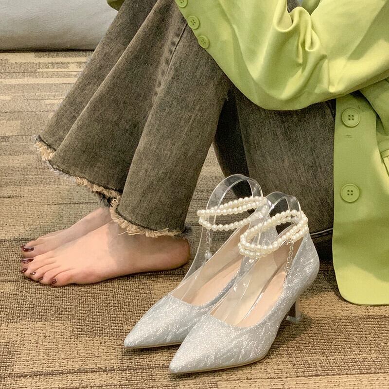 ポインテッドトゥシューズレディース 2023 春の新ファッションオールマッチレトロアインスタイルパールスティレットフェアリースタイルハイヒール 靴 スプリング 春物 真珠 jxjxf95921146013