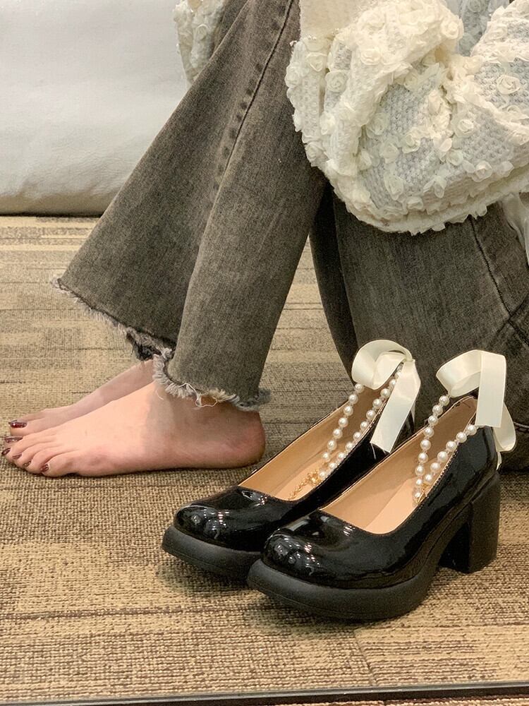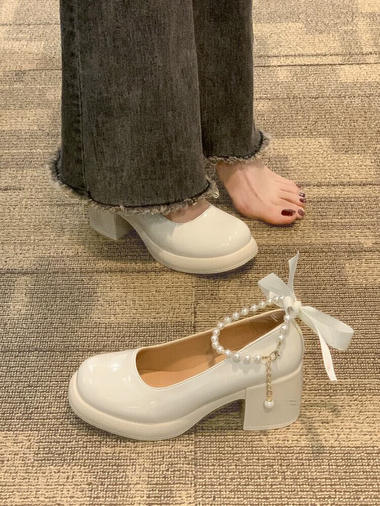 シングルシューズ女性の 2023 春の新ファッションオールマッチレトロ eign スタイルパールチャンキーヒールノンスリップメリージェーン革靴 スプリング 春物 レザー 真珠 jxjxf91776445894