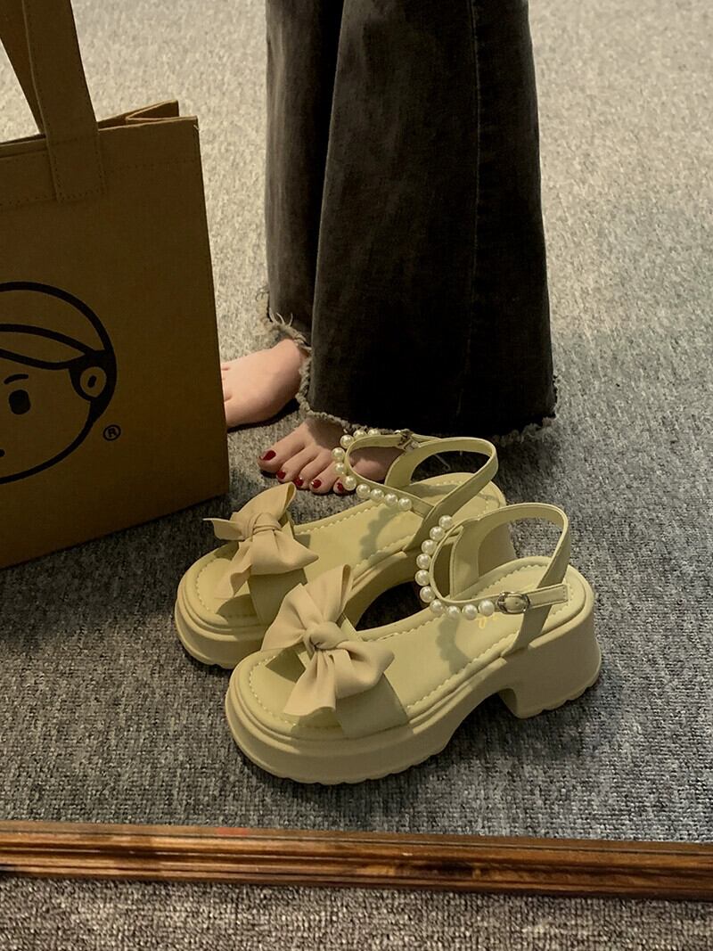 厚いヒールサンダルの女性の 2023 夏の新ファッションオールマッチレトロちょう結びパール気質ビーチシューズトレンド 靴 リボン サマー 夏物 真珠 jxjxf39919432770