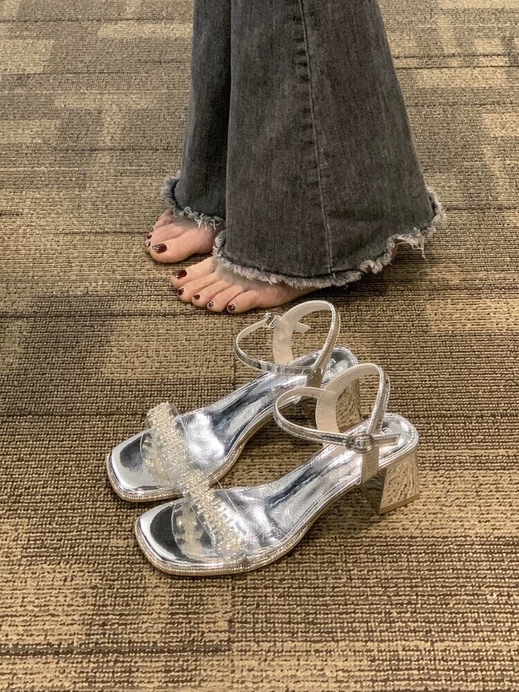 厚底サンダルレディース 2023 夏の新ファッションオールマッチレトロ気質ラインストーン透明一言ハイヒールシューズ 靴 サマー 夏物 jxjxf16312533325