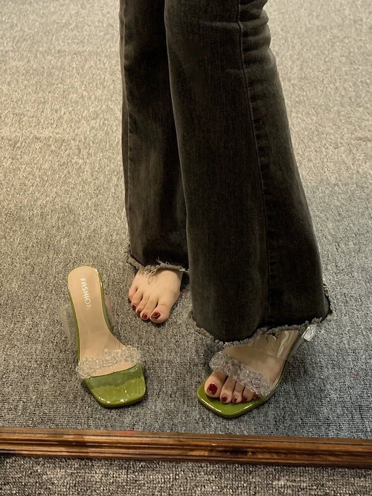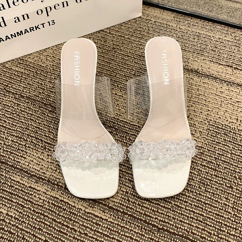 ネット赤スリッパ女性 2023 春の新スタイルのアウターファッション eign スタイルクリスタルフラワーハイヒール eign スタイル透明フリップフロップ レッド 靴 シューズ ミュール スプリング 春物 フラワーデザイン jxjxf86993763079