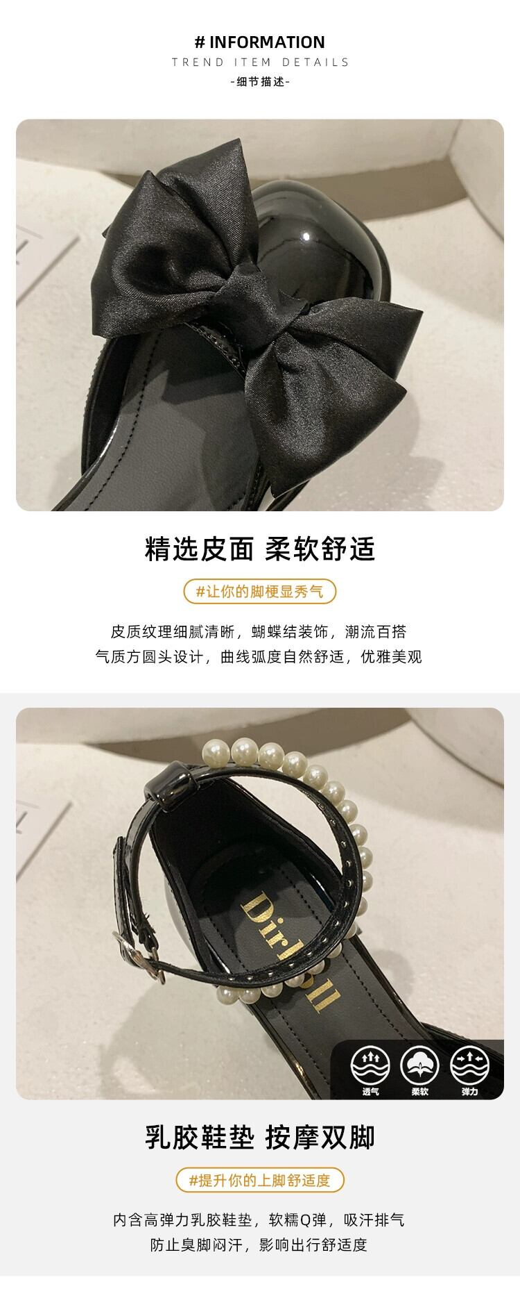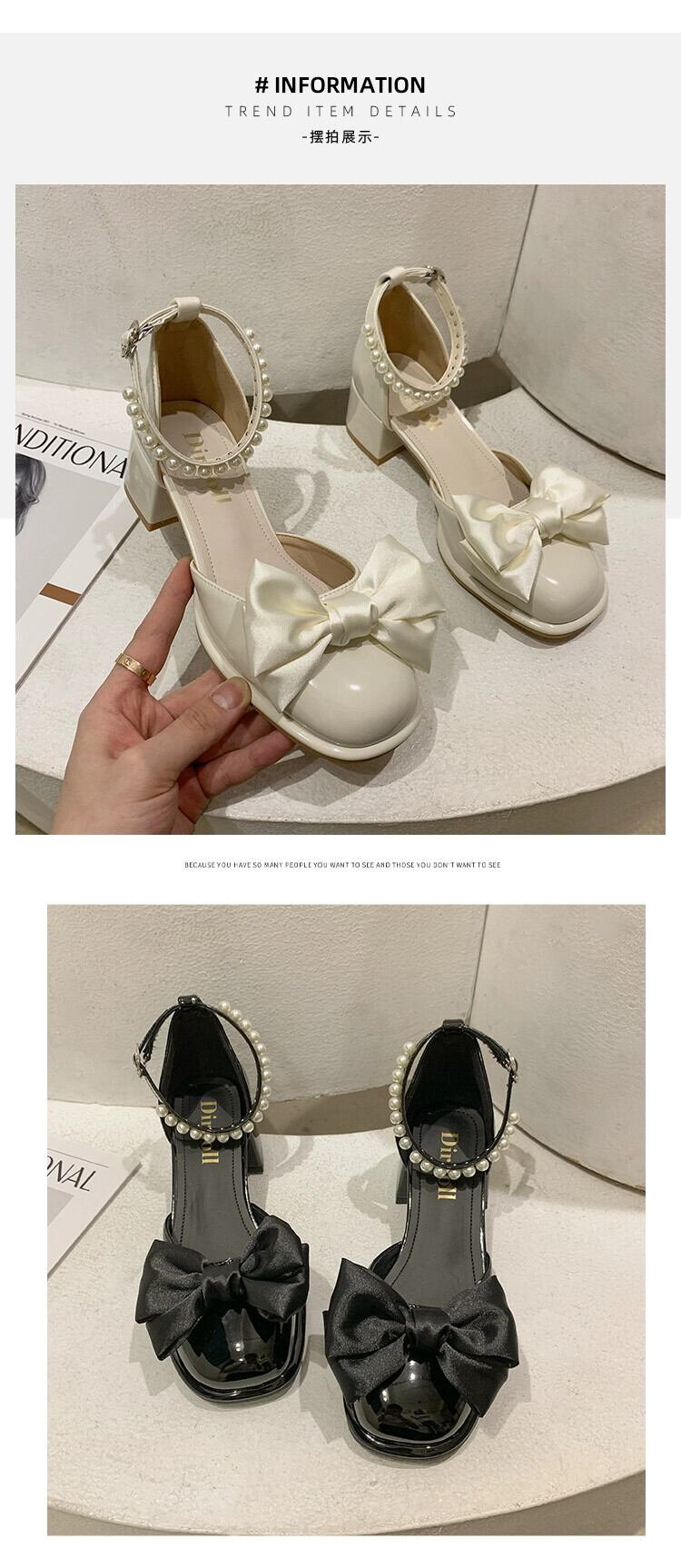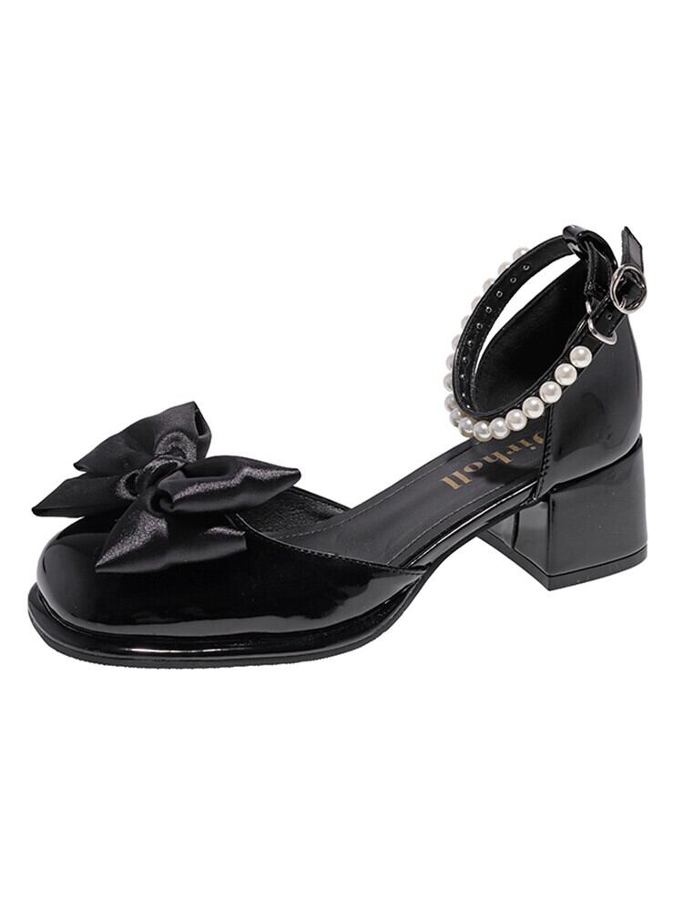 メアリージェーン婦人靴 2023 春の新ファッションオールマッチパールリボンチャンキーヒール滑り止めスクエアトゥ小さな革靴 シューズ スプリング 春物 レザー 真珠 スクウェア jxjxf54105248229