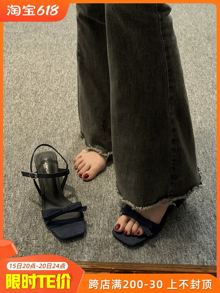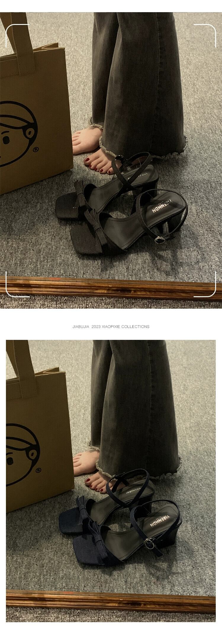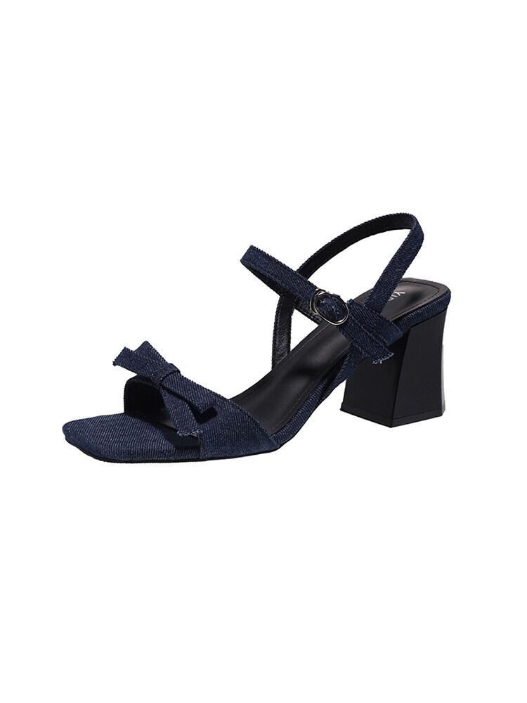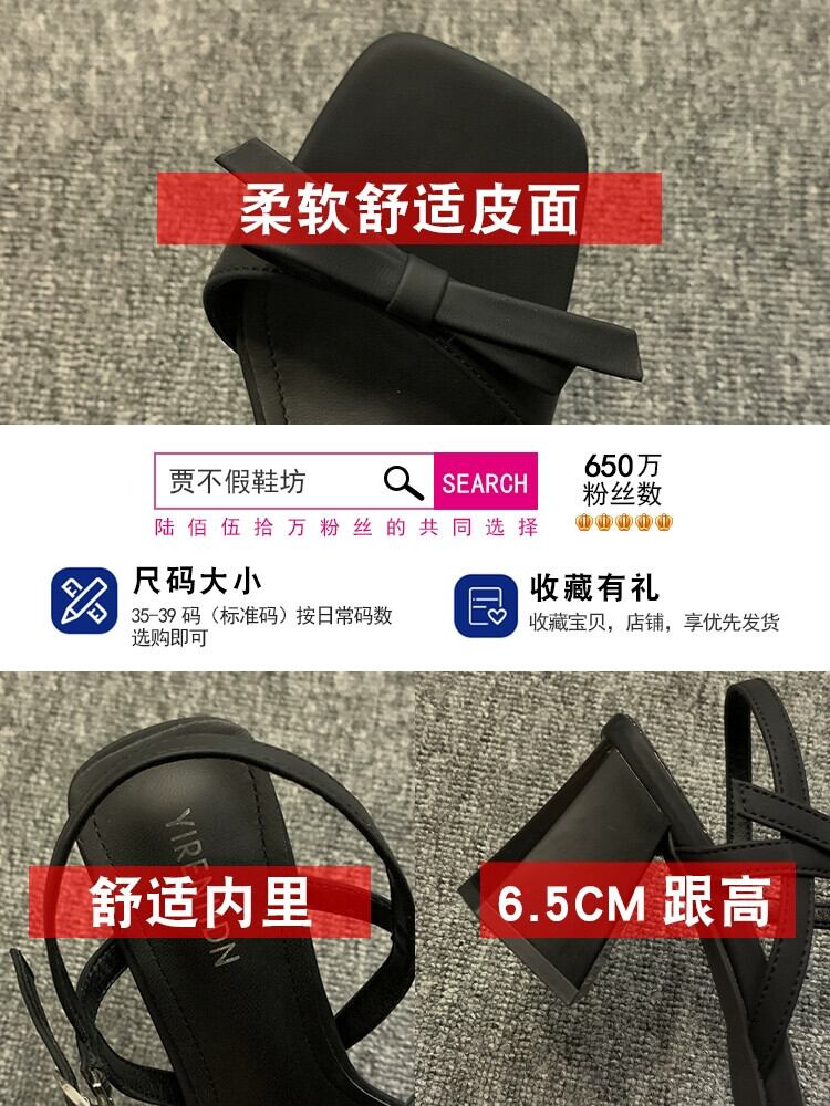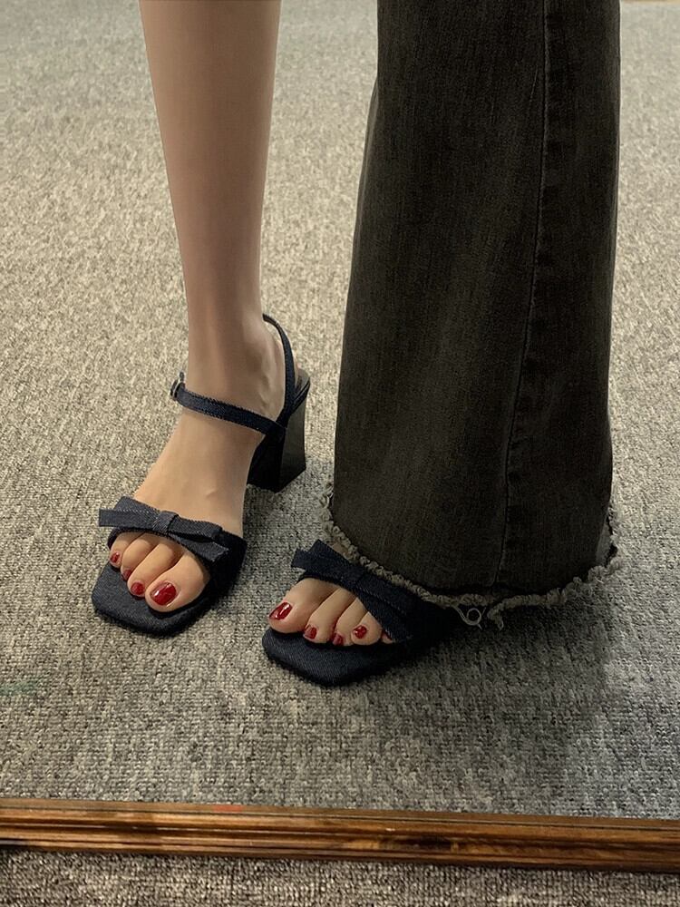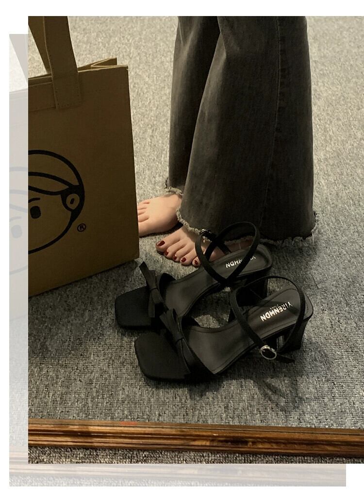 太いヒールサンダルの女性の 2023 夏の新ファッションオールマッチフレンチレトロハイエンド弓気質ハイヒール リボン 靴 シューズ サマー 夏物 jxjxf70566836404