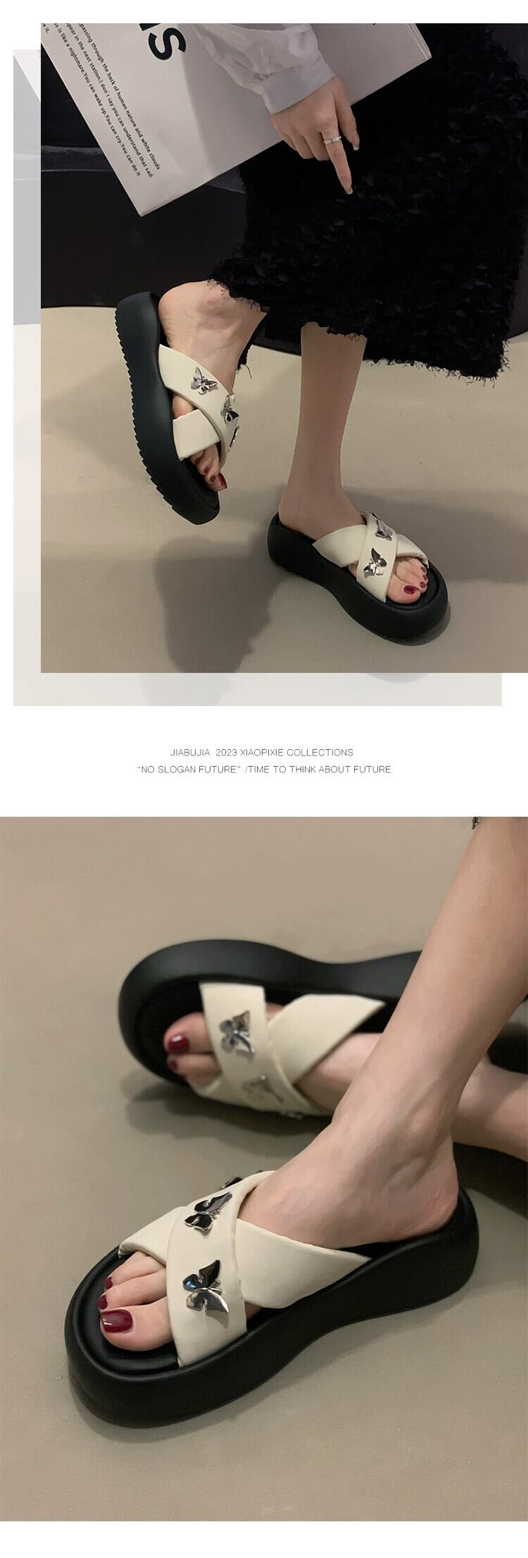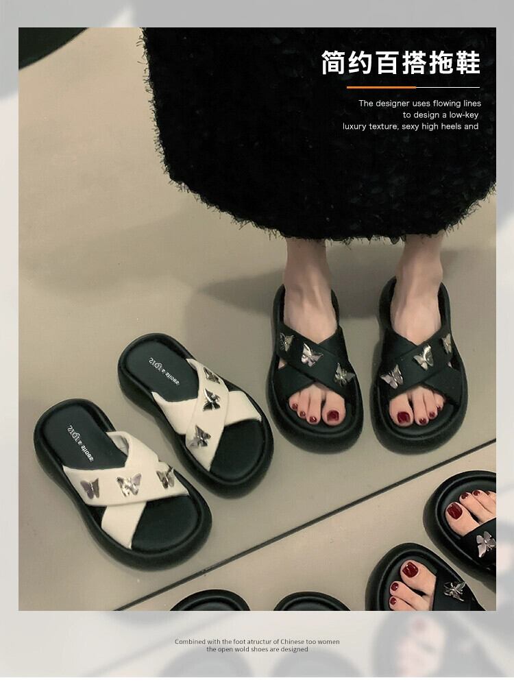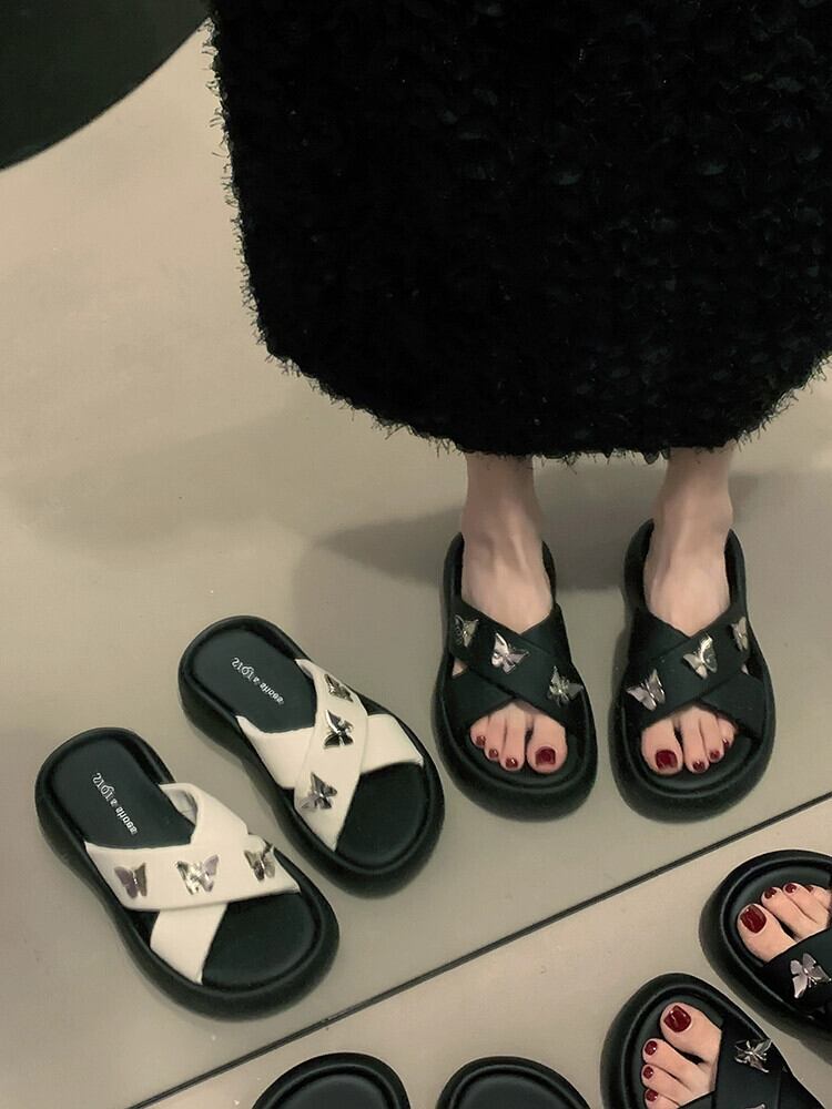 女性のスリッパアウターウェア 2023 夏の新ファッションオールマッチレトロアインスタイルバタフライ厚底 comtable ビーチサンダル ミュール 靴 シューズ サマー 夏物 jxjxf39032600216