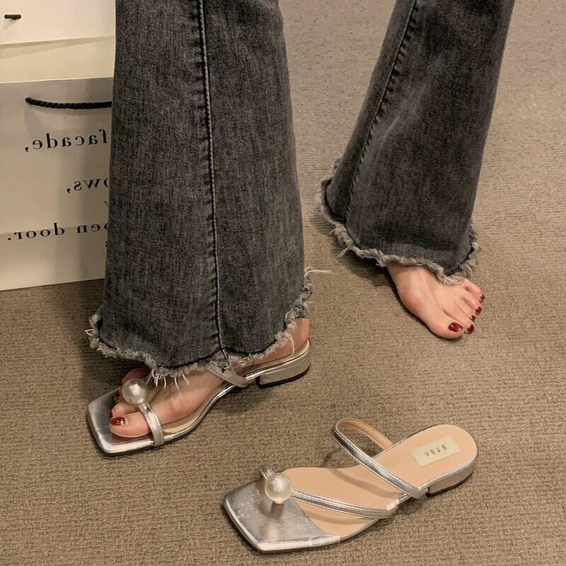 スーパーサンダルとスリッパの女性の 2023 夏の新しいファッションレトロオールマッチ厚いヒールアインスタイルパールセットトゥスリッパトレンド ミュール 靴 シューズ サマー 夏物 真珠 jxjxf89249143322