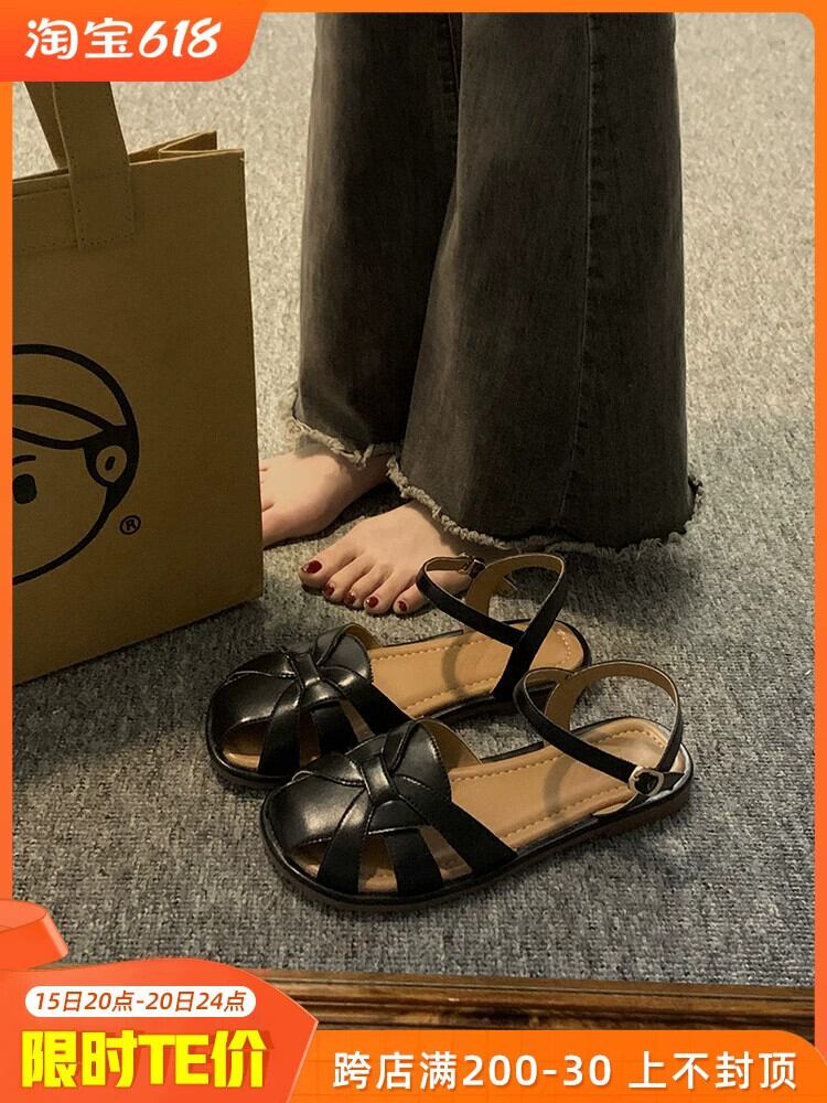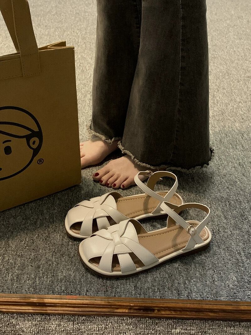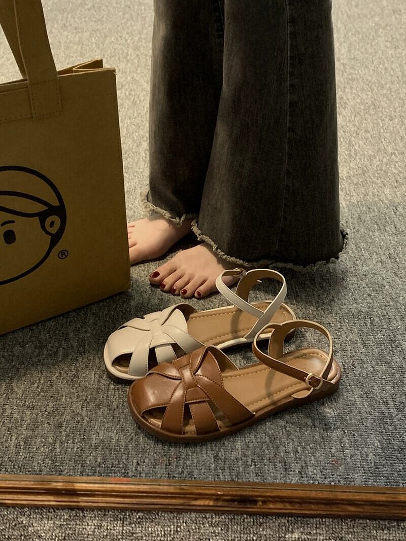 包頭サンダルの女性の 2023 夏の新ファッションオールマッチレトロな気質中空フラットビーチローマンシューズトレンド 靴 サマー 夏物 jxjxf32960661036