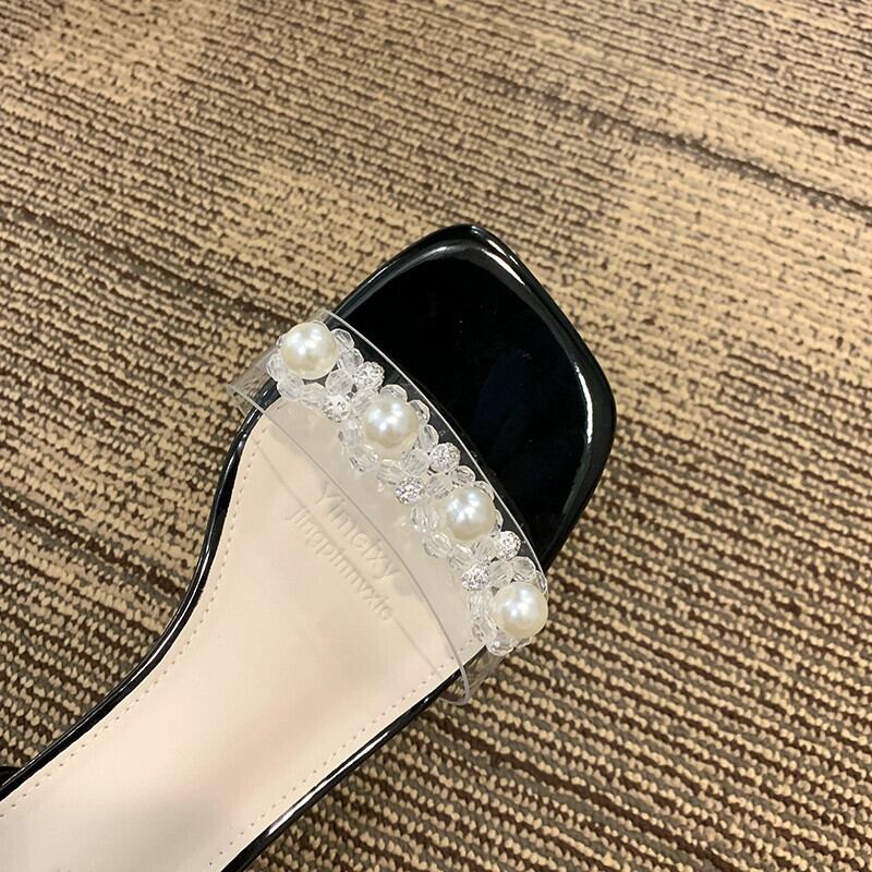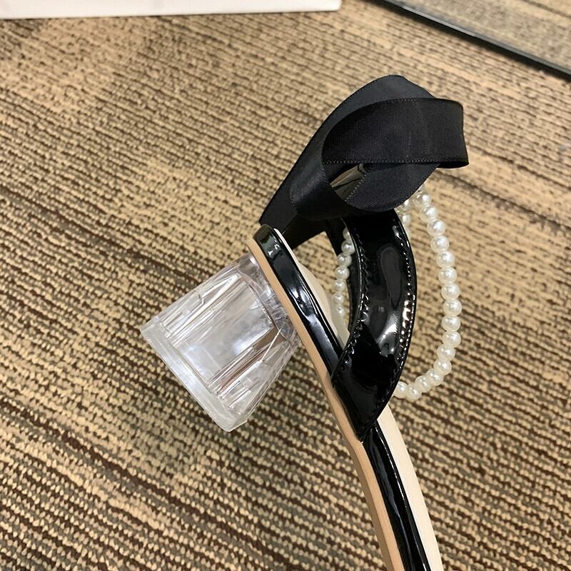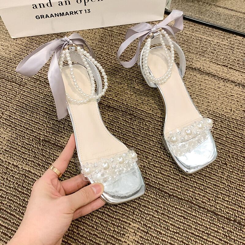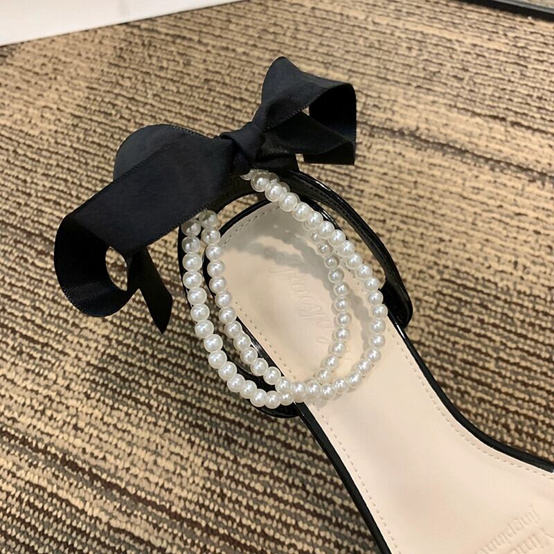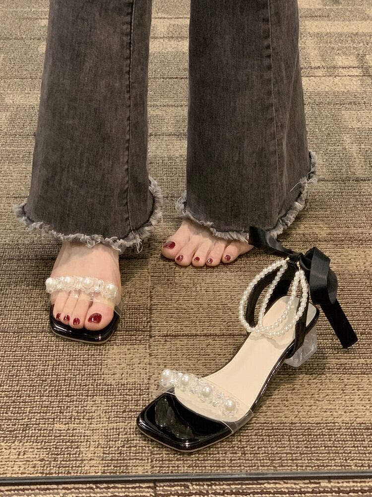 厚底サンダルの女性の 2023 夏の新ファッションフレンチラインストーンパールリボン気質ハイヒールシューズ 靴 サマー 夏物 真珠 jxjxf79398496373