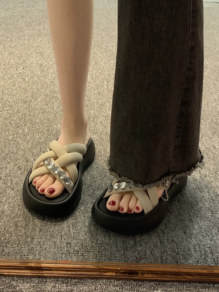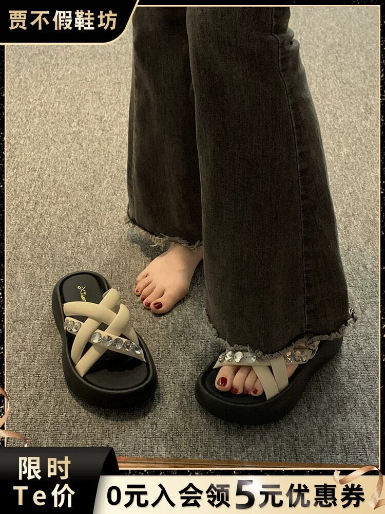 Jiabu 偽オンラインセレブスリッパ女性のアウターウェア 2023 夏の新ファッションレトロラインストーン厚底 comtable ビーチサンダル ミュール 靴 シューズ サマー 夏物 jxjxf43516530643