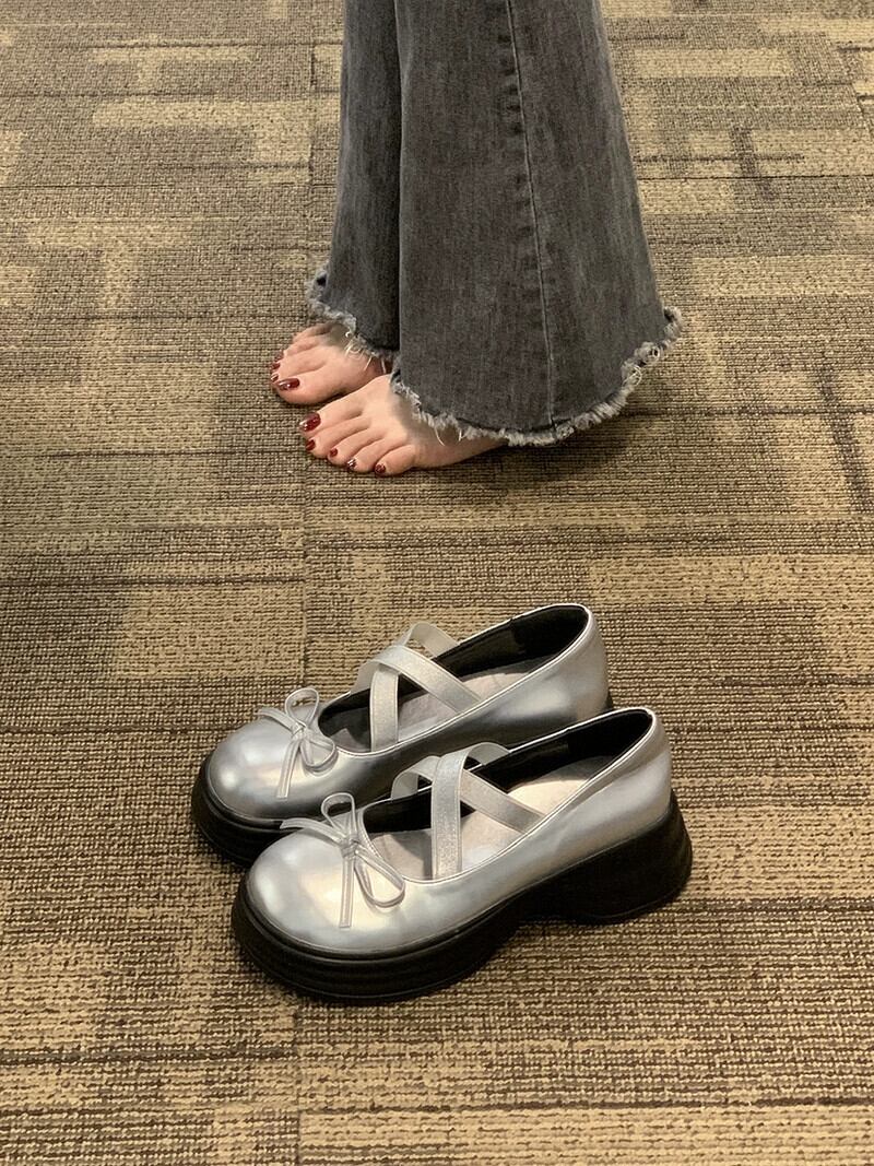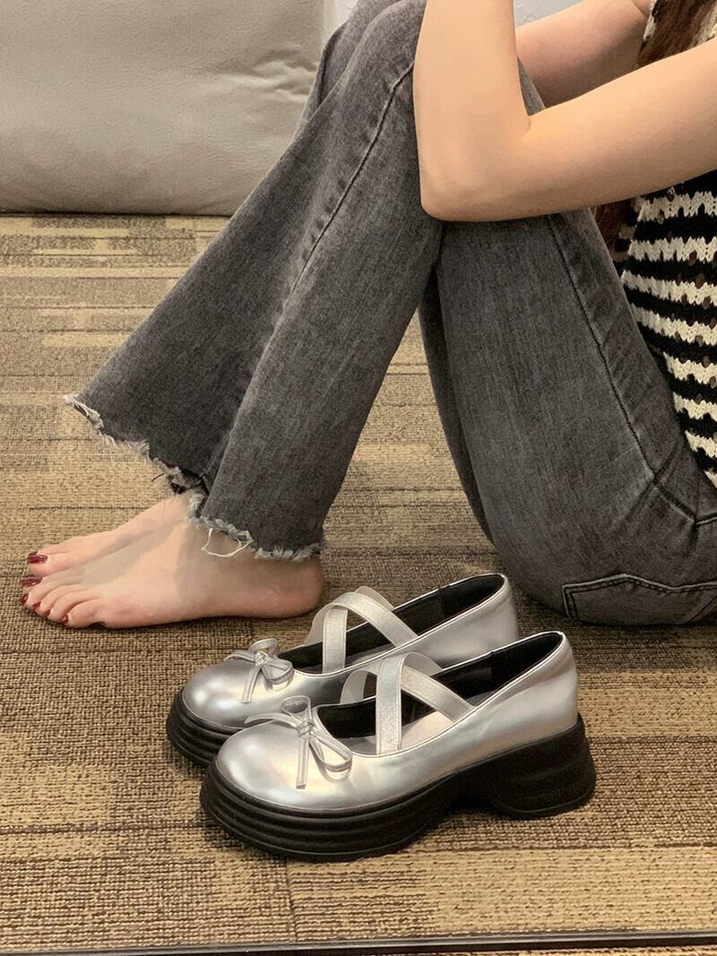 Jiabu 偽シングルシューズ女性の 2023 夏の新フレンチスタイルのシンプルなちょう結び厚底メリージェーン革靴 リボン サマー 夏物 レザー jxjxf58577900003