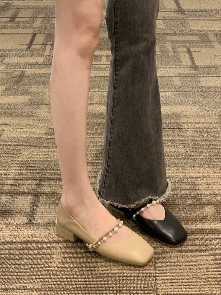 Jiabu 偽スクエアトゥシングルシューズ女性の 2023 夏の新ファッション優しいレトロパールローヒール小さな革靴 サマー 夏物 レザー 真珠 スクウェア jxjxf66208299107