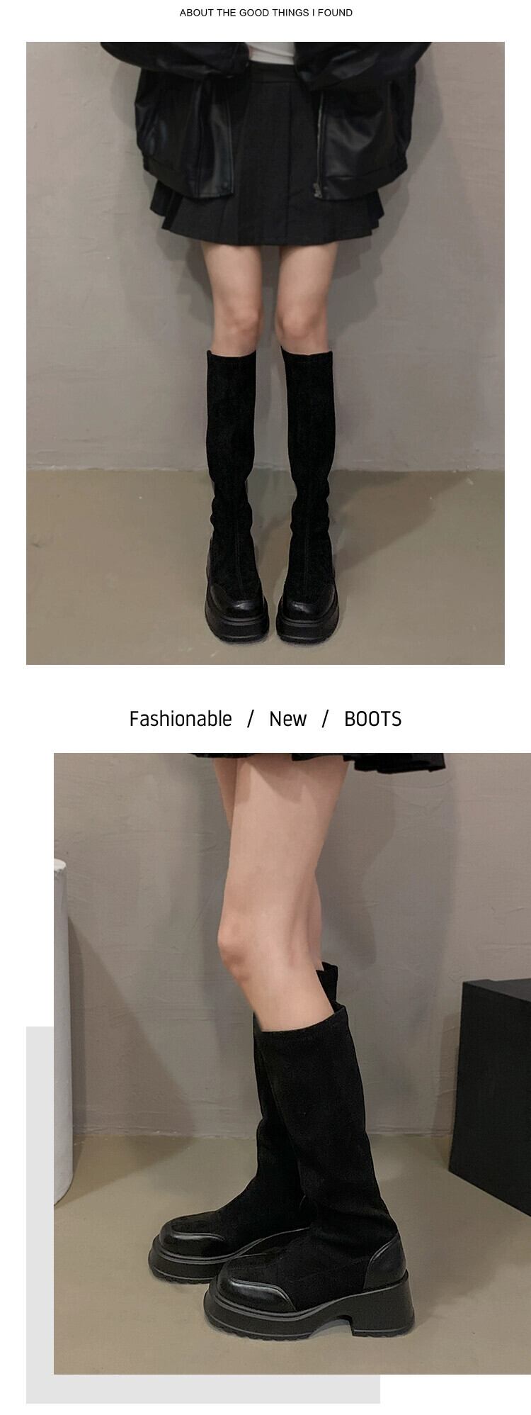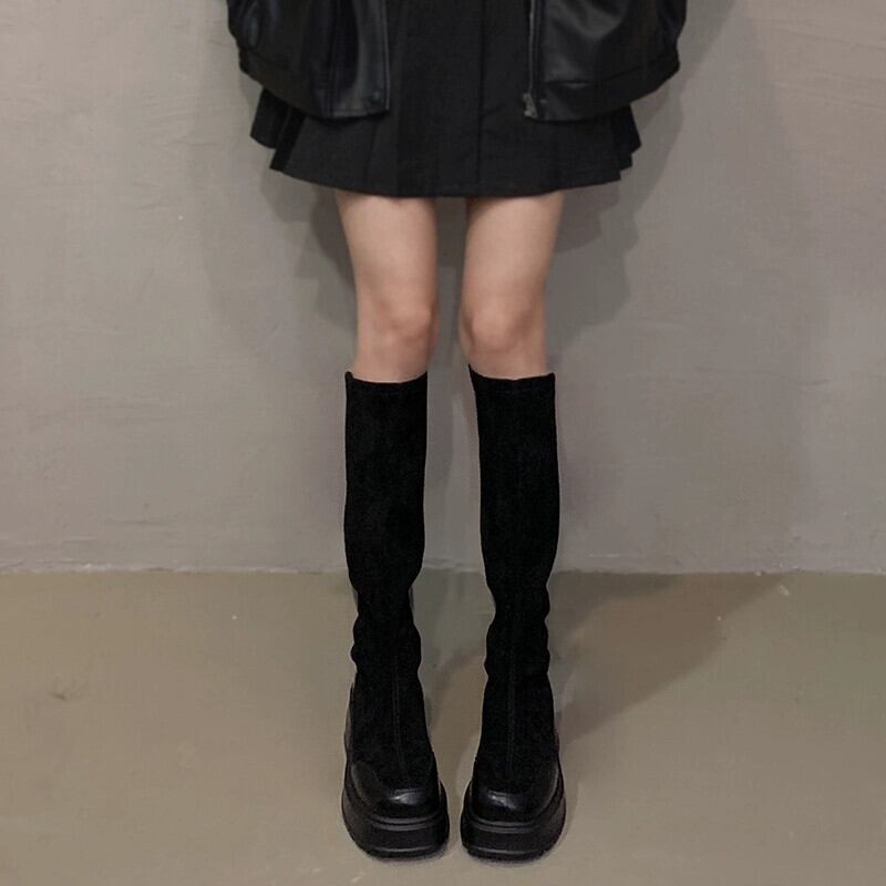 Jia Bujia ニーハイブーツの女性 2023 秋の新ファッションレトロスリム厚いヒール弾性スリムブーツトレンディな 靴 シューズ エラスティック 伸縮 オータム 秋物 jxjxf93828892452