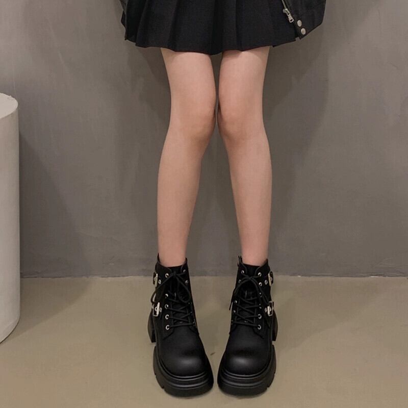 Jia Bufake ショートブーツ女性 2023 秋の新ファッション多用途レトロベルトバックル厚いヒールハンサムマーティンブーツトレンディな 靴 シューズ オータム 秋物 ハーネス jxjxf61416512832