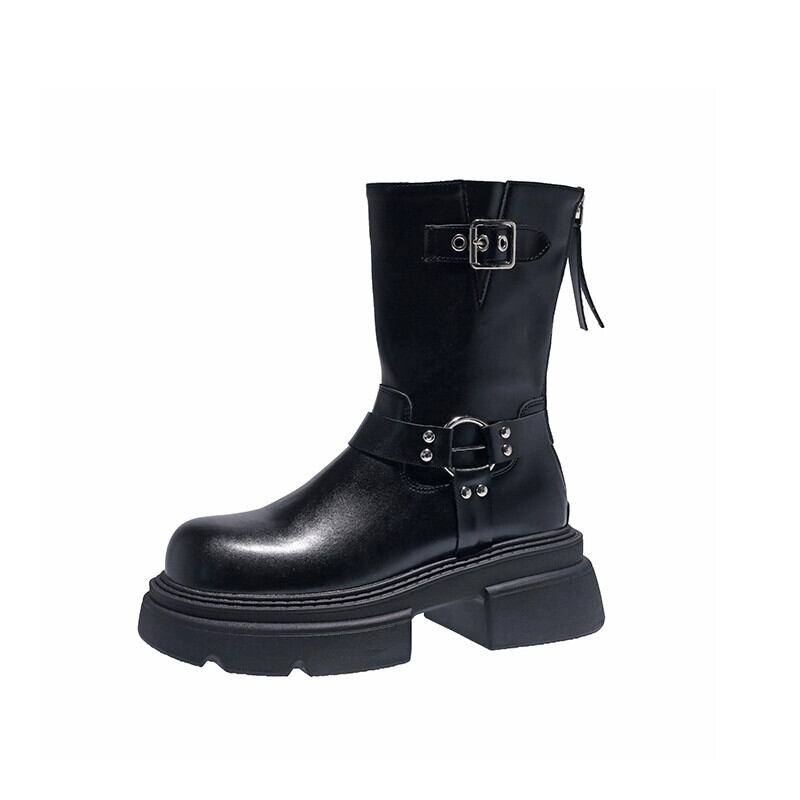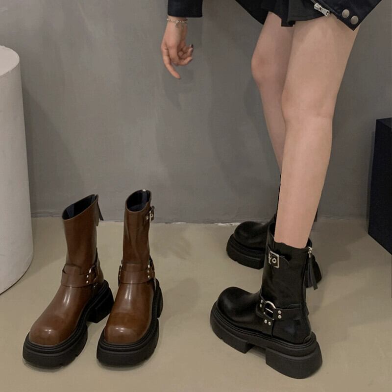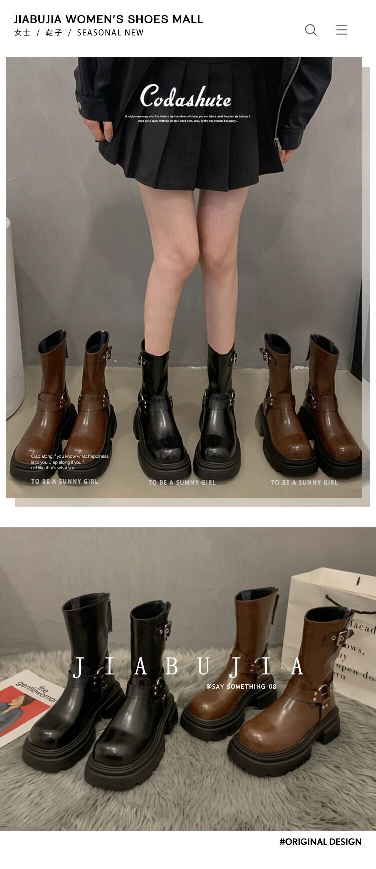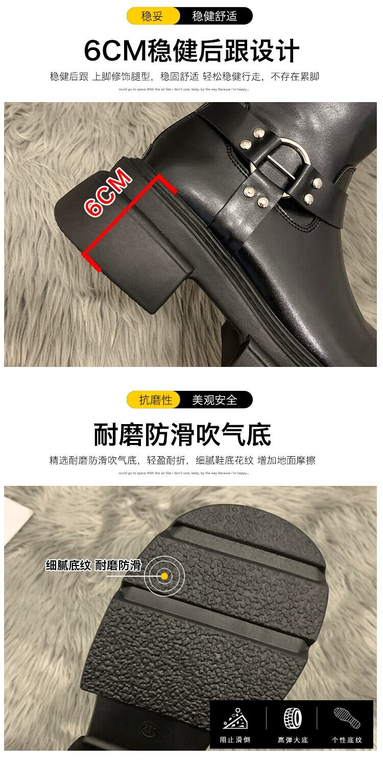 Jia Bufake 厚いヒールショートブーツの女性 2023 秋の新トレンディなベルトバックルスタイルのオートバイのブーツ 靴 シューズ オータム 秋物 ハーネス jxjxf5951064903