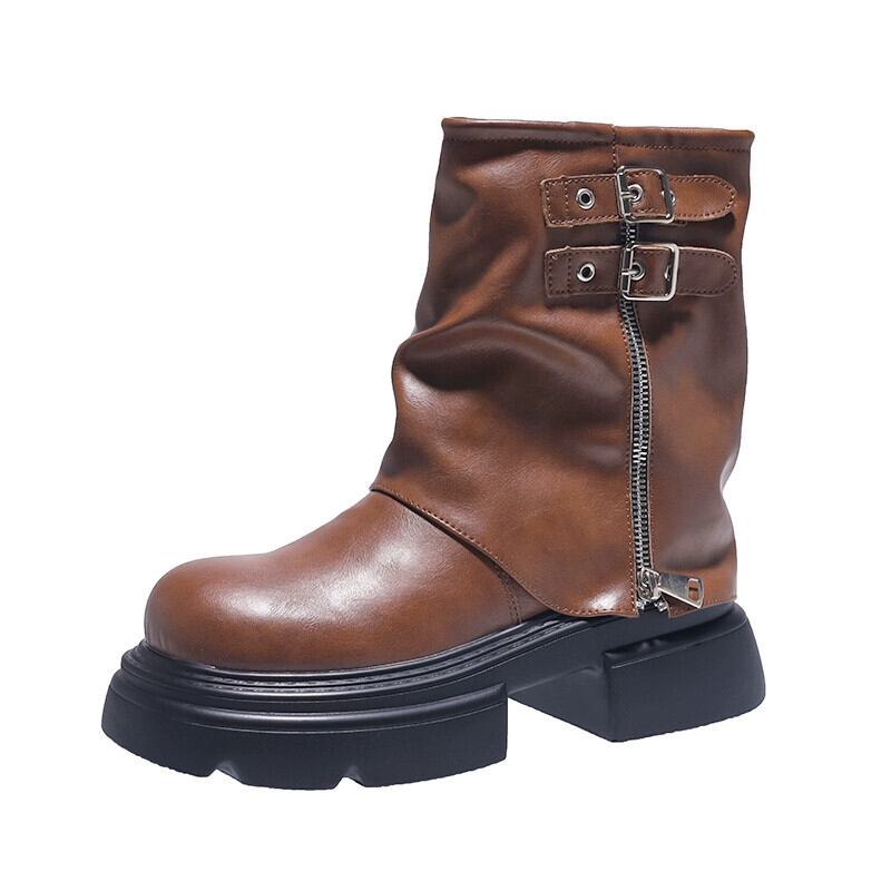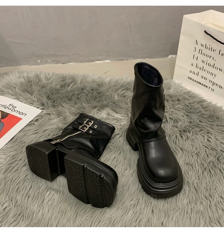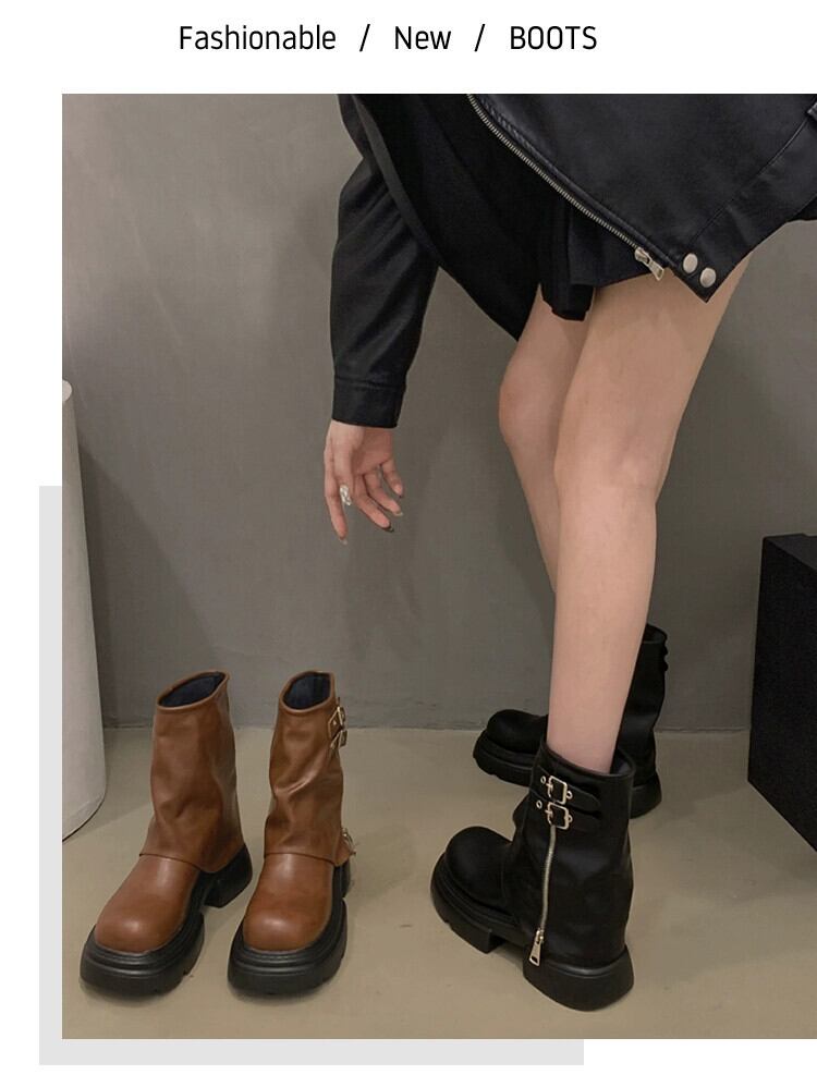Jia Bujia レディースショートブーツ 2023 新しい秋スタイルファッショナブルなベルトバックルハンサムファッション厚底ズボンブーツ 靴 シューズ オータム 秋物 ハーネス jxjxf52963637630