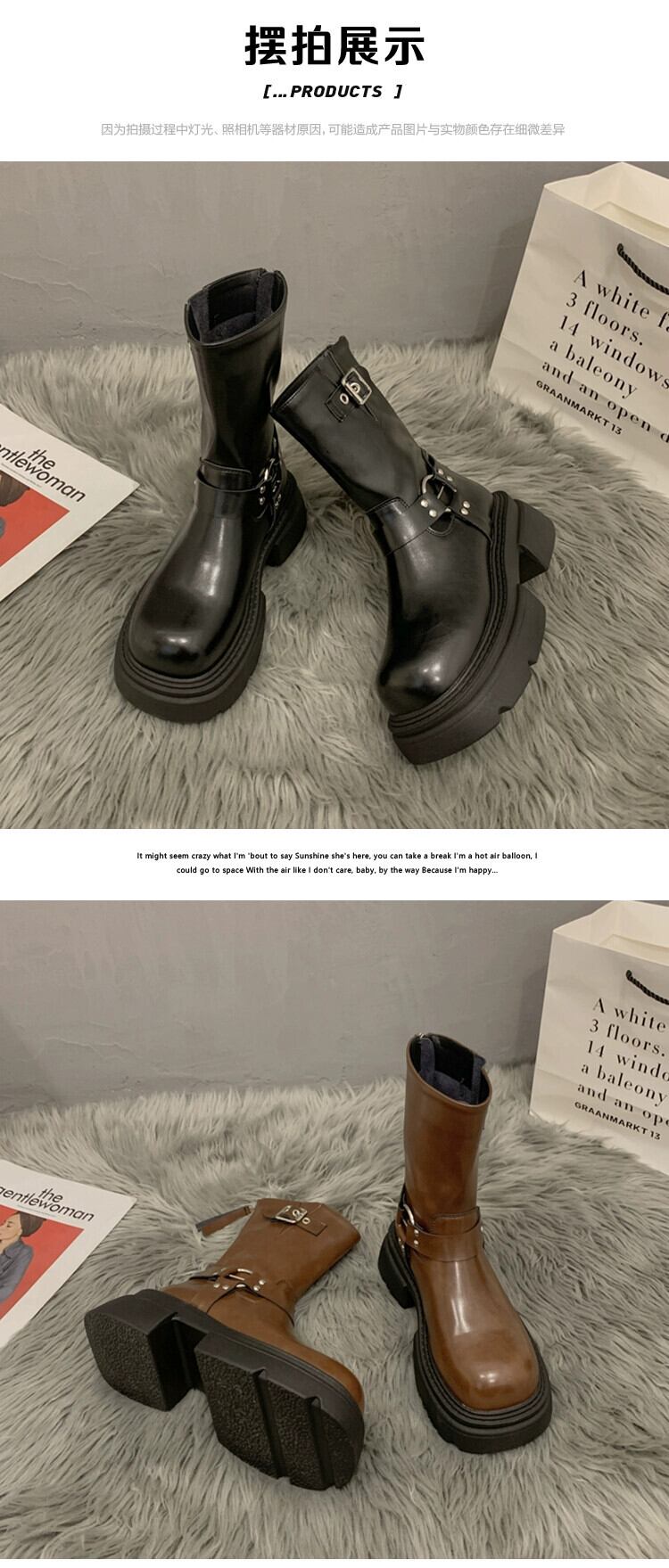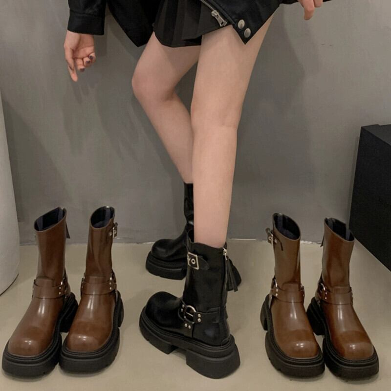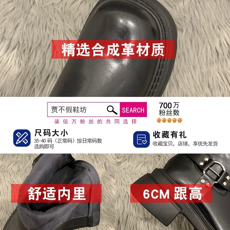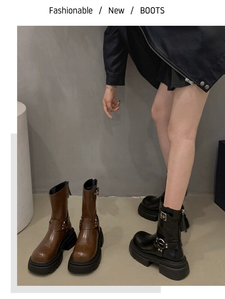 Jia Bujia インターネット有名人のオートバイのブーツの女性 2023 秋の新アメリカンレトロベルトバックルハンサム高めショートブーツ 靴 シューズ オータム 秋物 ハーネス jxjxf79284844410