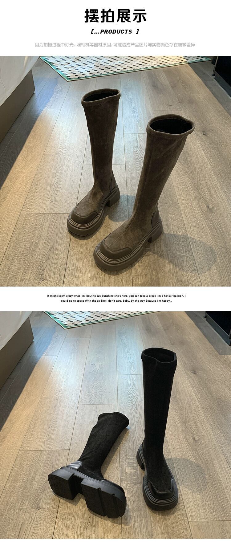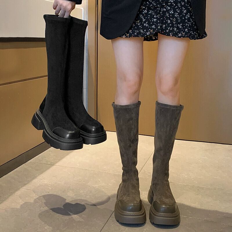 Jia Bujia 厚底スクエアトゥノーニーブーツ女性 2023 新しい秋のレトロな気質スリムストレッチブーツ 靴 シューズ オータム 秋物 スクウェア jxjxf37124563806