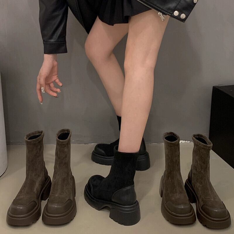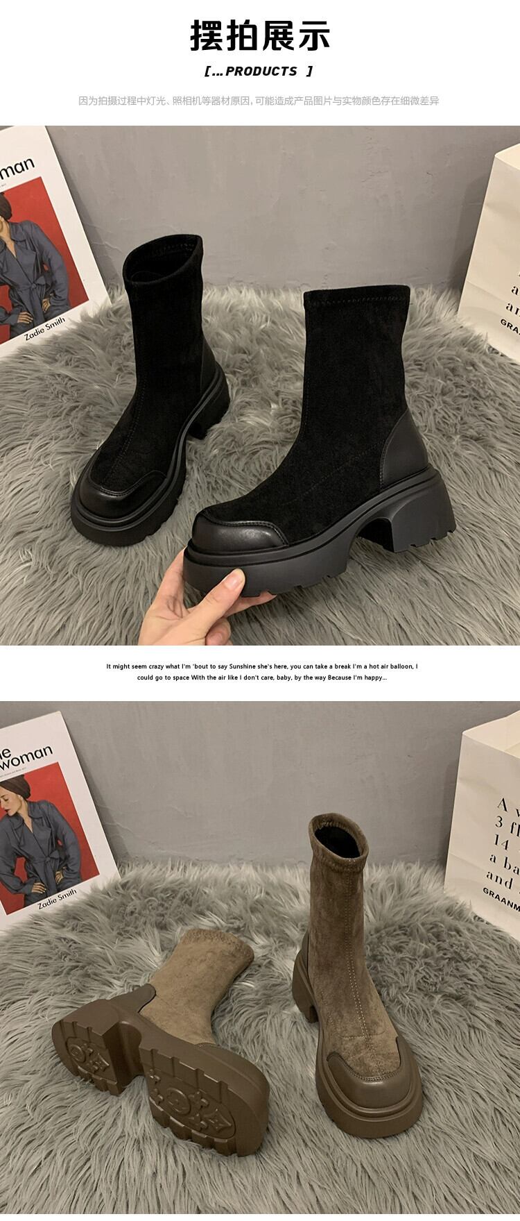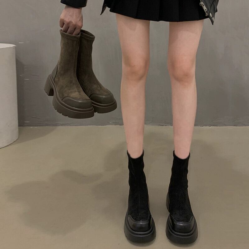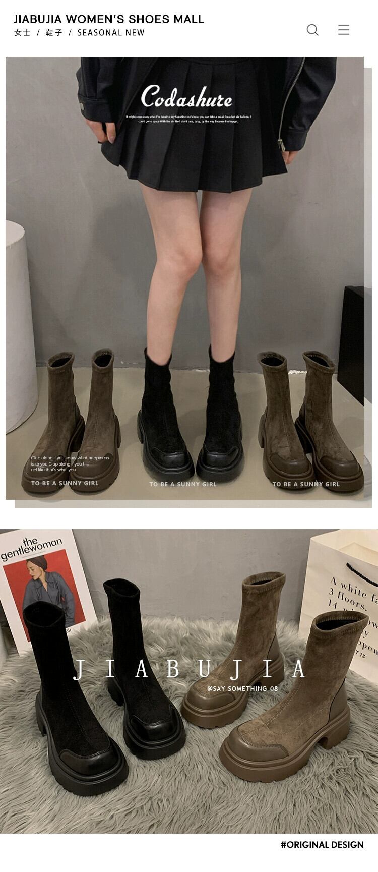 Jia Bujia 弾性ショートブーツの女性 2023 秋の新ファッション多用途フレンチレトロ太いヒールファッショナブルなスリムブーツ 靴 シューズ エラスティック 伸縮 オータム 秋物 jxjxf60641785455