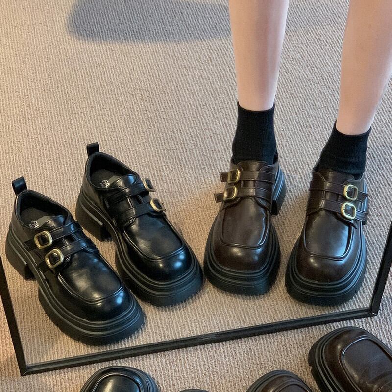 Jia Bujia 英国スタイルの小さな革の靴の女性 2023 秋の新ファッションベルトバックルフレンチ厚いヒールローファー シューズ オータム 秋物 レザー ハーネス jxjxf82589905915