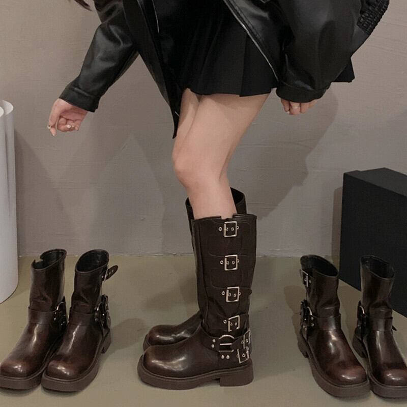 Jia Bufake ブーツの女性 2023 秋の新スタイルレトロベルトバックル太いヒールハンサムスリム騎士ブーツ 靴 シューズ オータム 秋物 ハーネス jxjxf73384681253