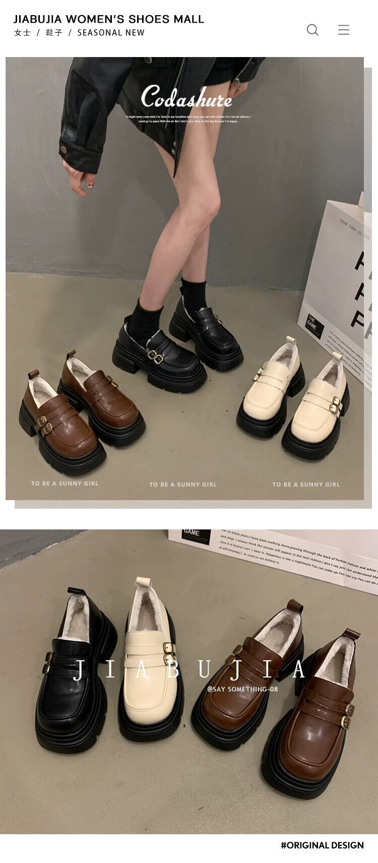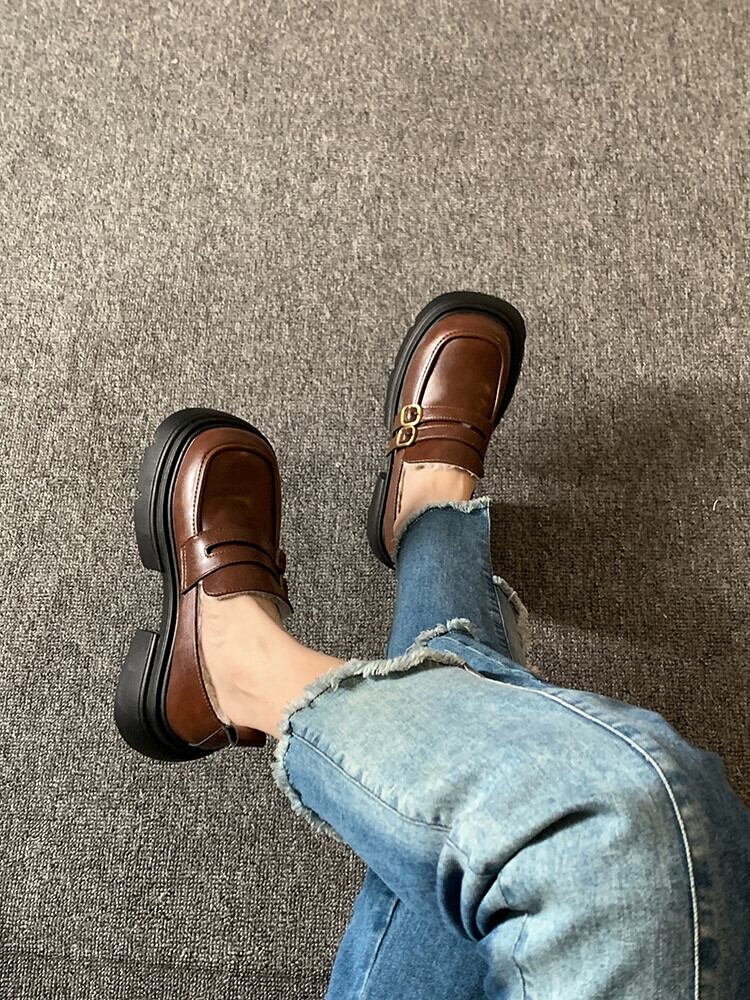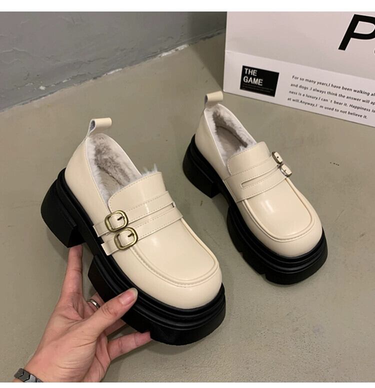 Jia Bujia 冬の小さな革の靴の女性 2023 冬の新スタイルのシンプルな気質ベルトバックルプラスベルベット厚いヒールローファー シューズ ウィンター 冬物 レザー ハーネス jxjxf57979910392