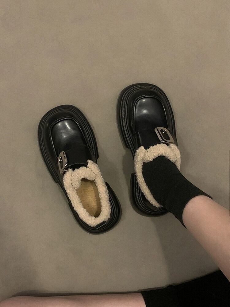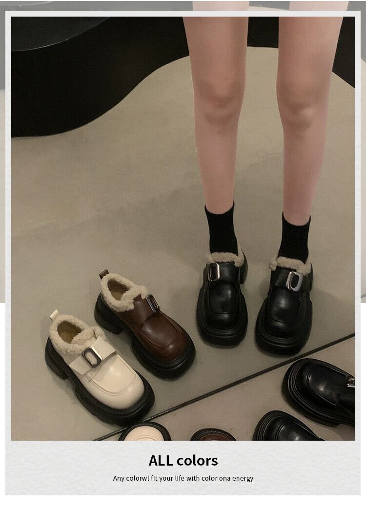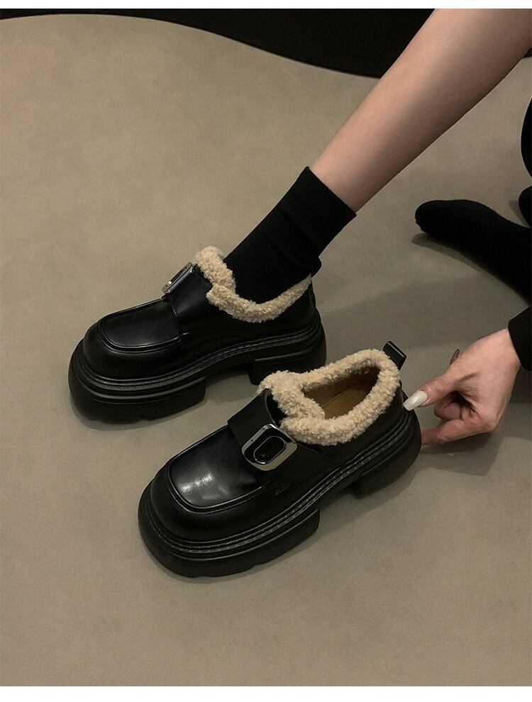 Jia Bujia ローファー女性の 2023 冬の気質通勤プラスベルベット厚いヒールスクエアトゥシューズトレンディ 靴 ウィンター 冬物 スクウェア jxjxf45448819652