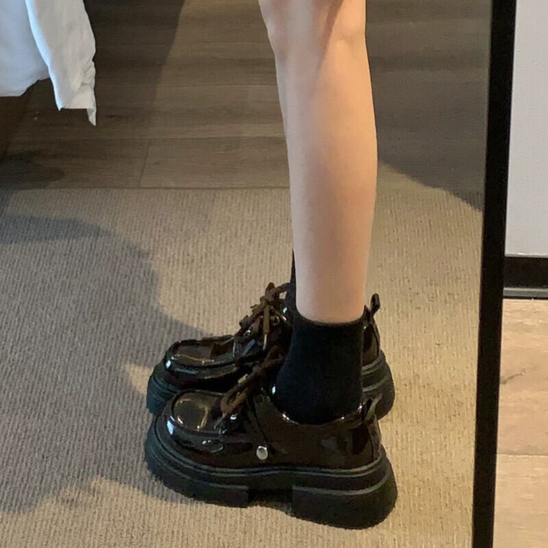 Jia Bu 偽厚いヒールの革の靴の女性 2023 冬人気のフレンチレトロな弓かわいい増強靴 シューズ リボン 大人ガーリー スウィート キュート カジュアル ウィンター 冬物 レザー jxjxf52974950759